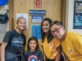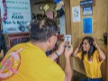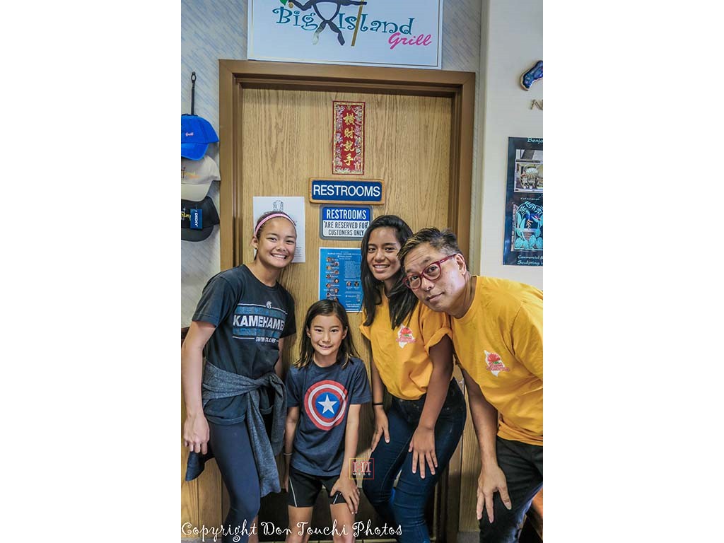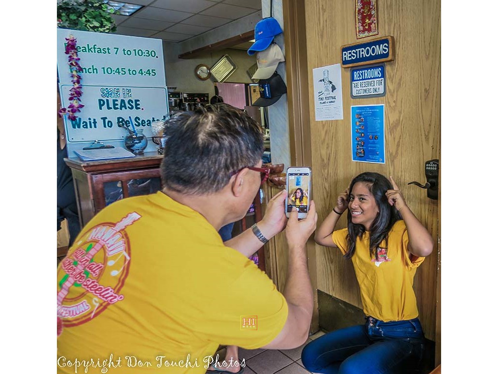 • Breakfast for one of the school presentation teams. Alan snaps a picture of Mālie pointing to the festival flyer posted on the Big Island Grille's bulletin board.