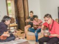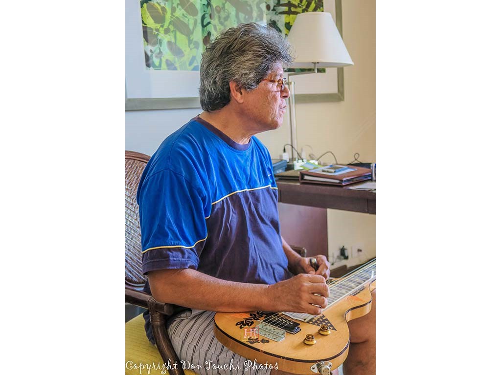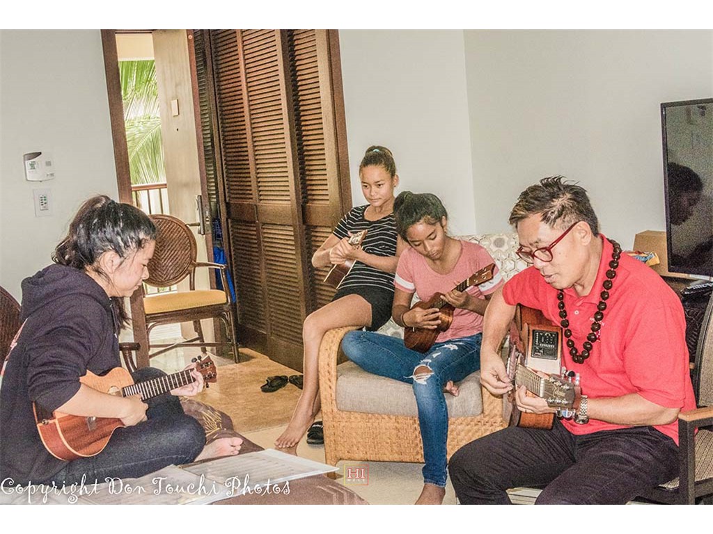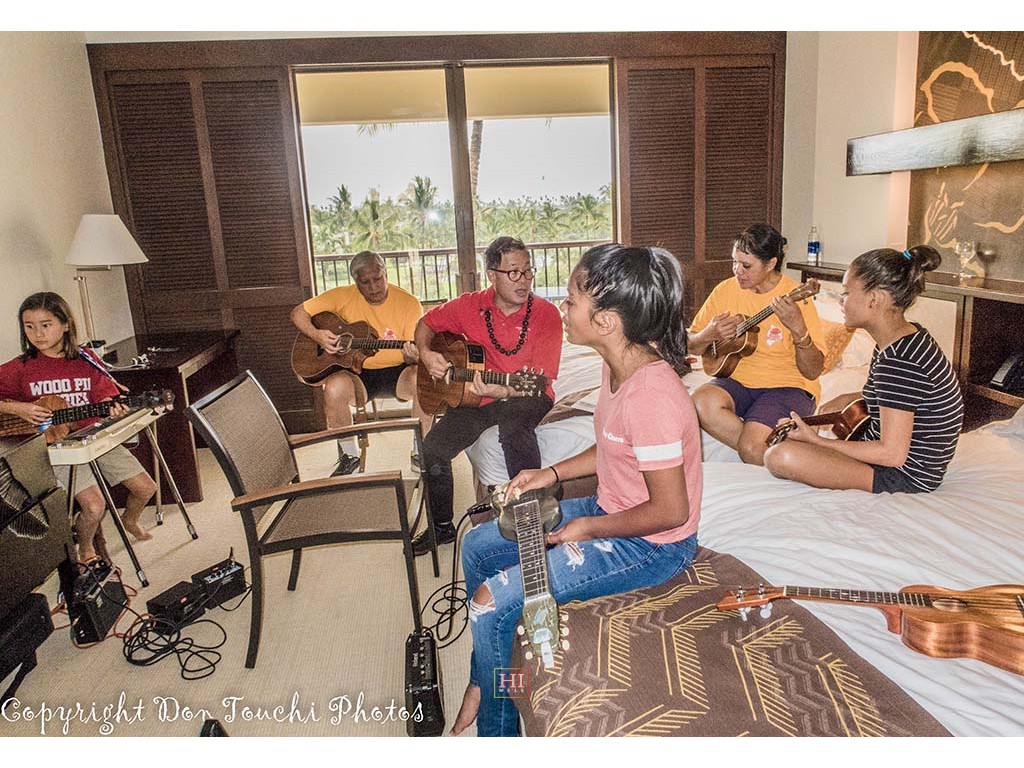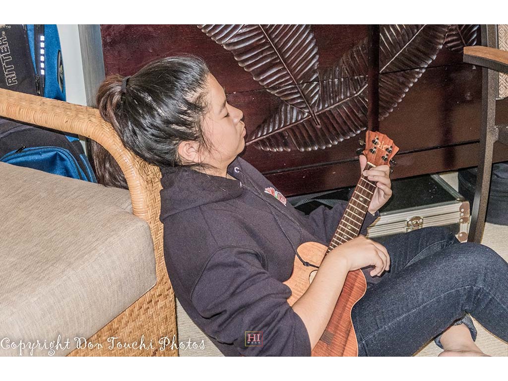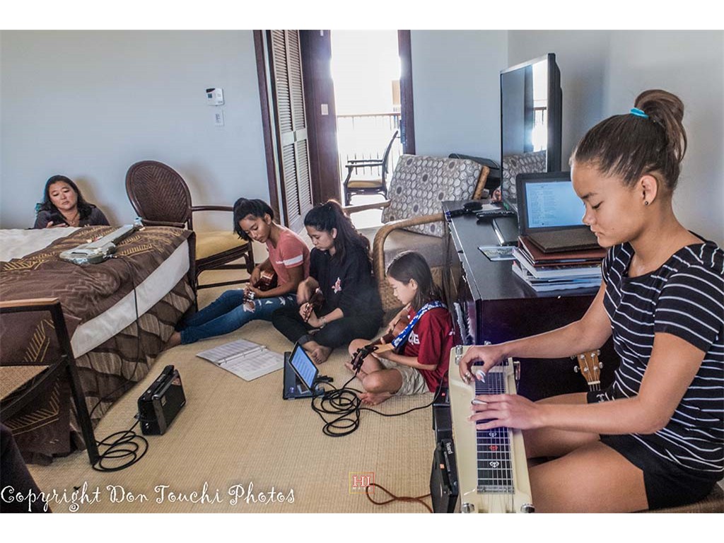 Steel Guitarist Joey Misailidis rehearses one of her selections. Also in picture: SooJean Misailidis, Mālie Lyman, Alexis Tolentino, and Tai Misailidis.