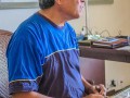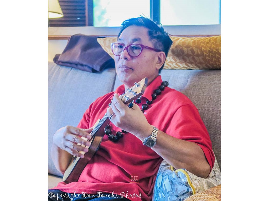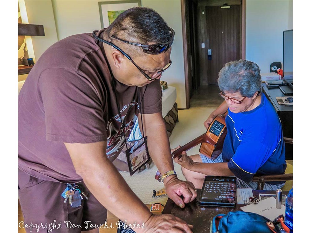 Ke Kula Mele musicians rehearsed in another room. Shown here are guitarists Addison Ching and Alan Akaka.