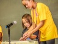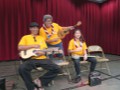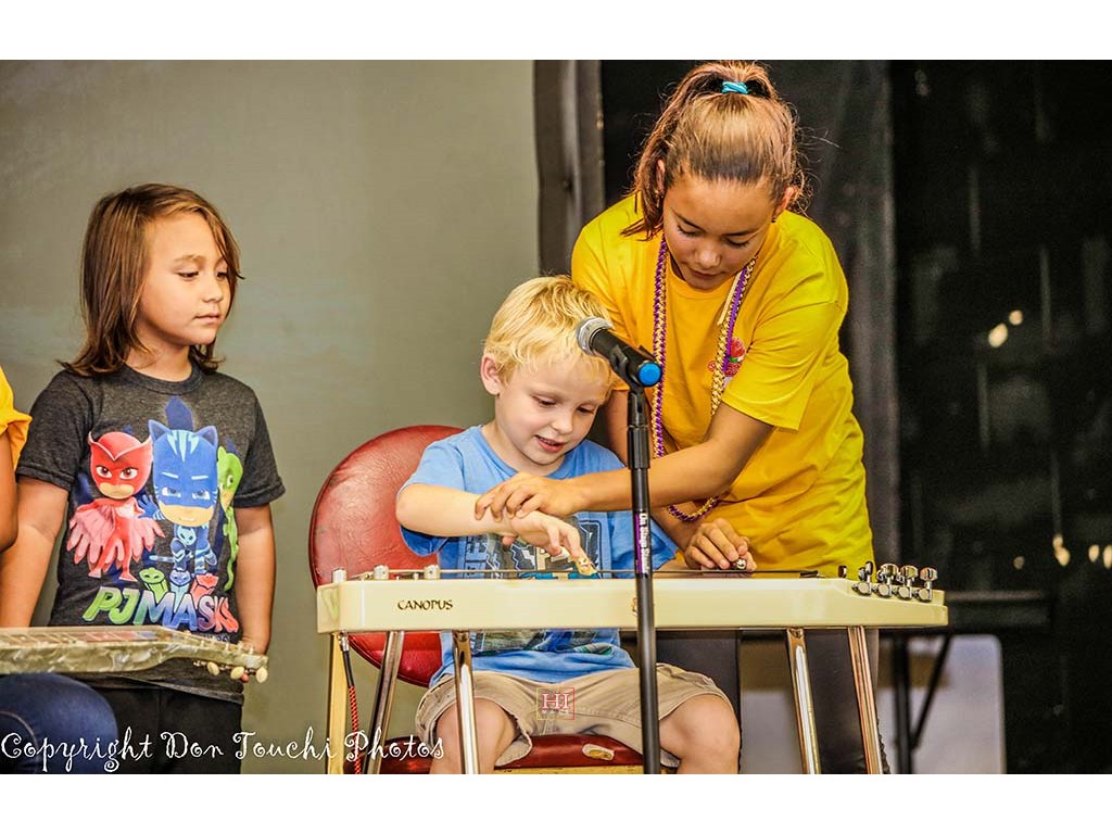 • Students are encouraged to try out the steel guitar. Joey shows this student how to pck the strings.