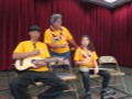 • Alexis demonstrates the steel guitar with help from Ron and Greg. Photo by Sandy Sardinha.