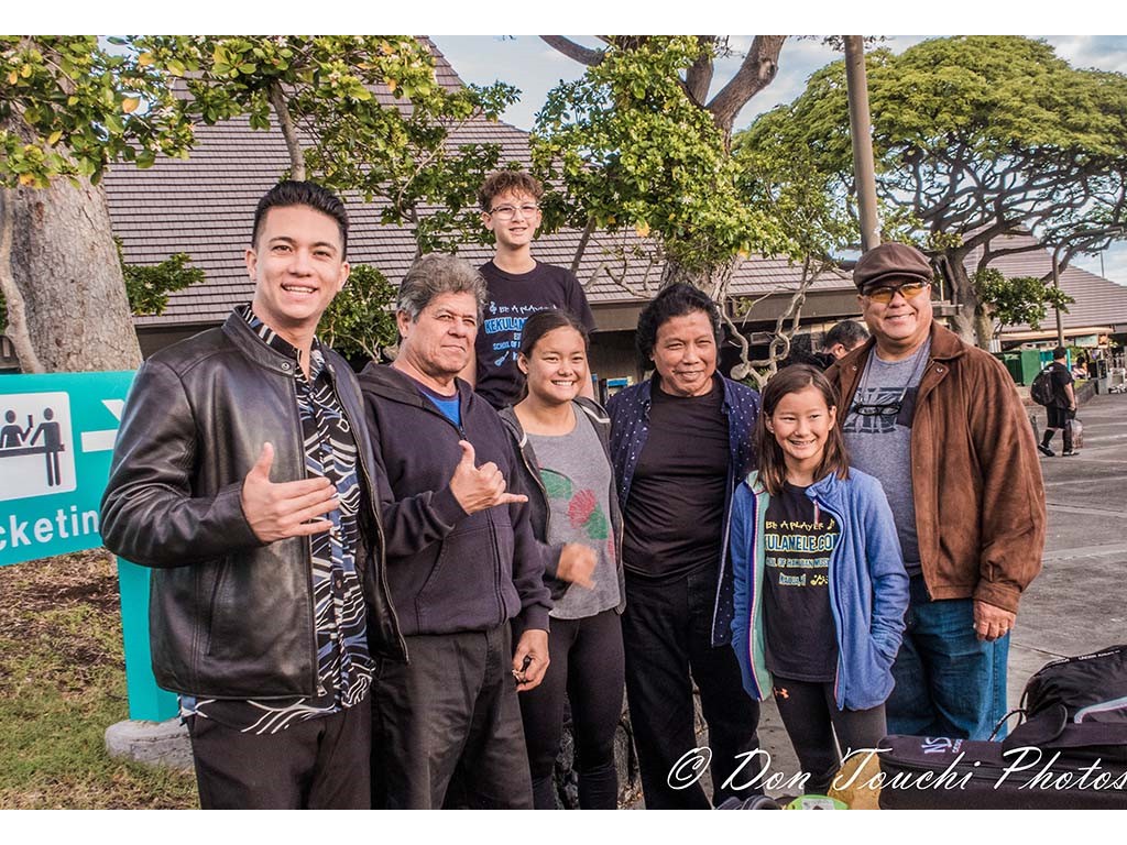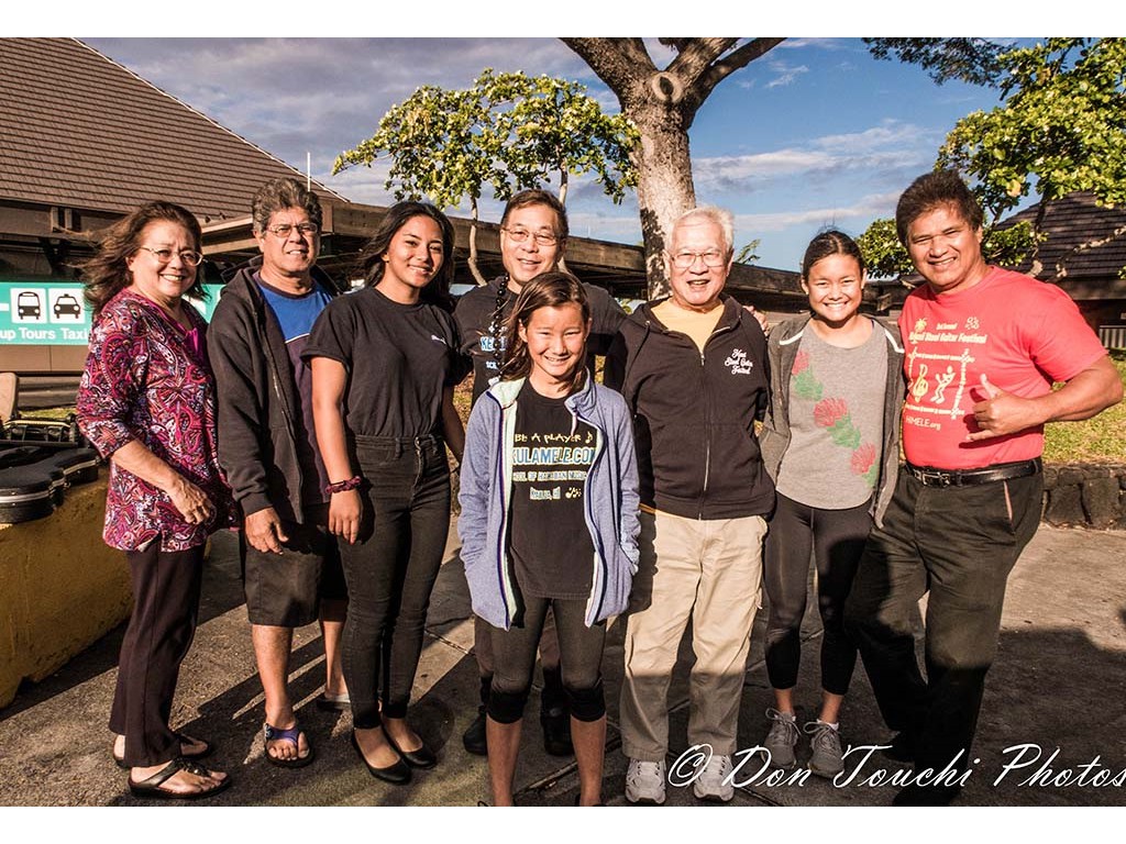 • Festival musicians and staff. From Left: Sandy Sardinha, Greg Sardinha, Mālie Lyman, Alan Akaka, Tai Misailidis, Don Touchi, Joey Misailidis, and Eric Keawe.