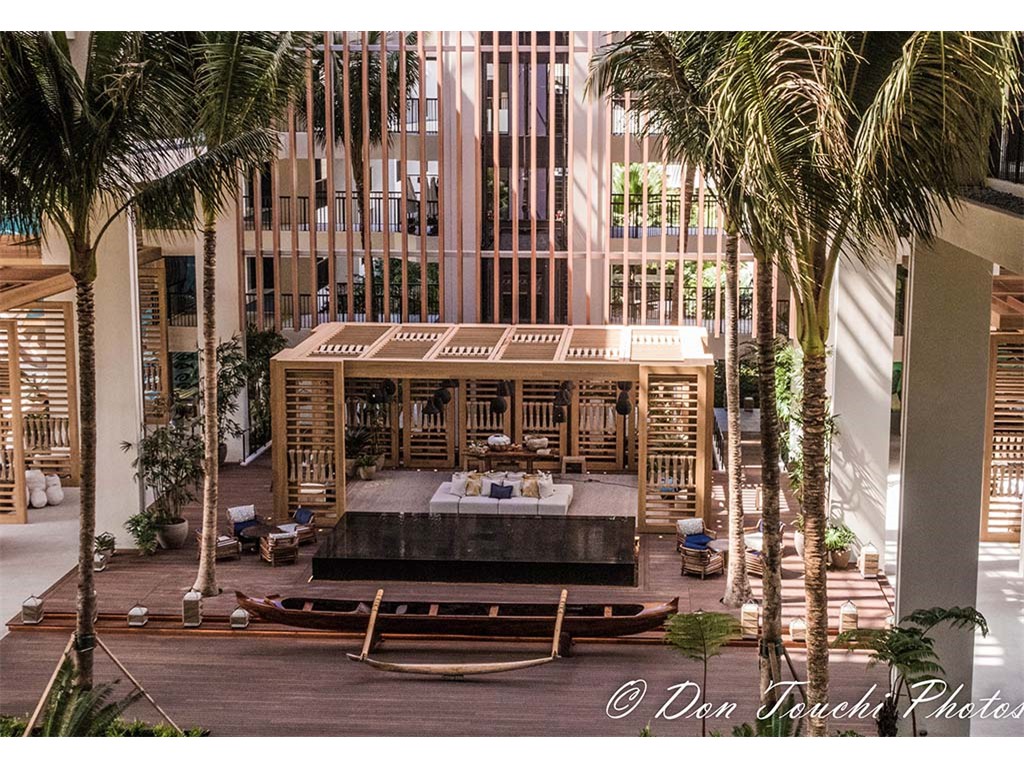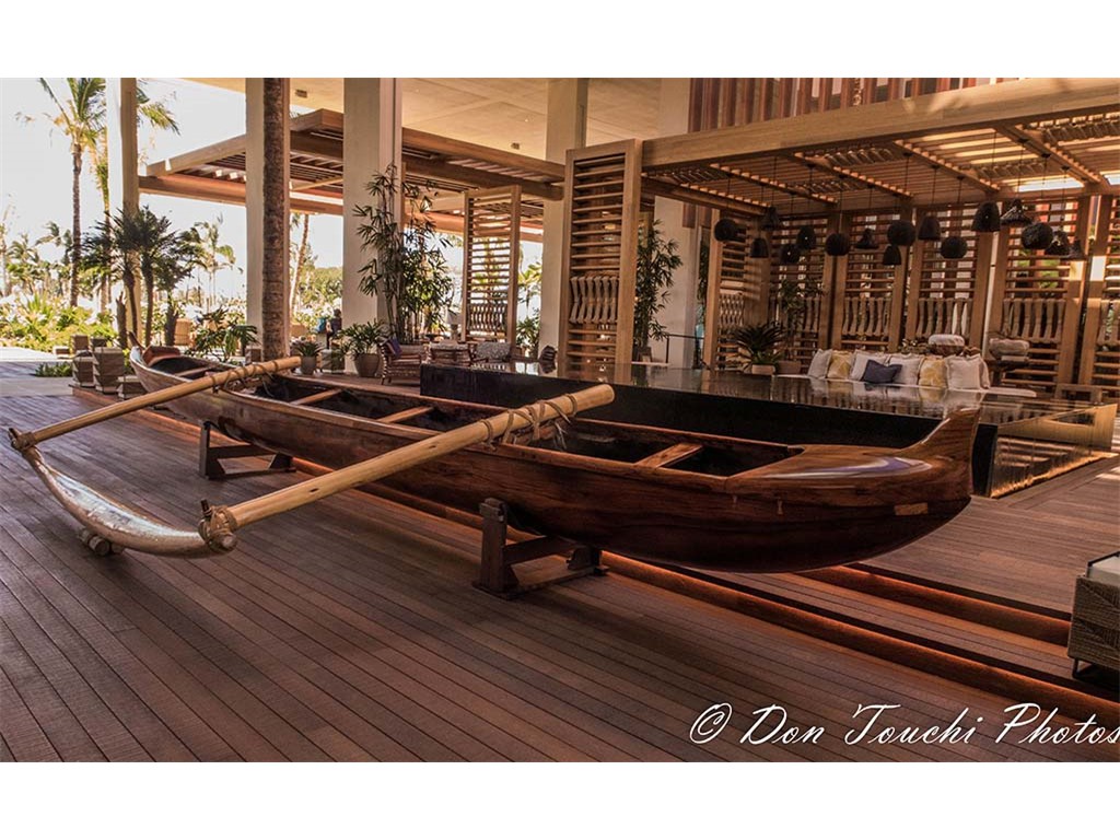 • The newly-remodeled lobby of the Mauna Lani features an outrigger canoe.