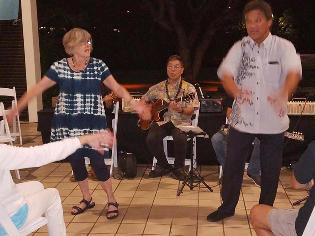 Kanikapila musician Eric Keawe showing a guest how to dance the ''Hukilau.''