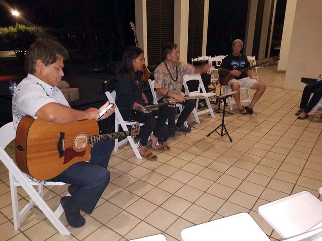 Kanikapila musicians from left: Eric Keawe, Mālie Lyman, ALan Akaka, and Natan Goore.