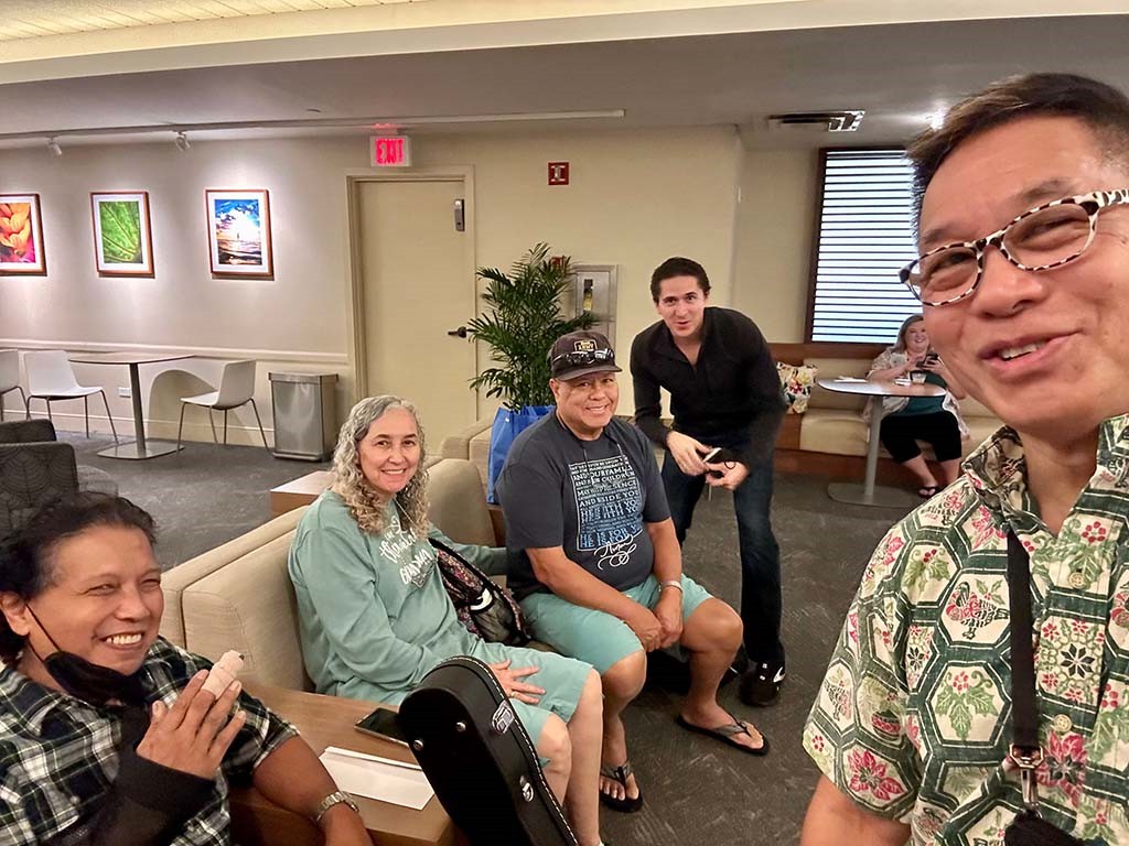 In the Hawaiian Airlines lounge: Bobby Ingano, Napua and Kaipo Asing, Joseph Zayac, and Alan Akaka. PC-Alan Akaka