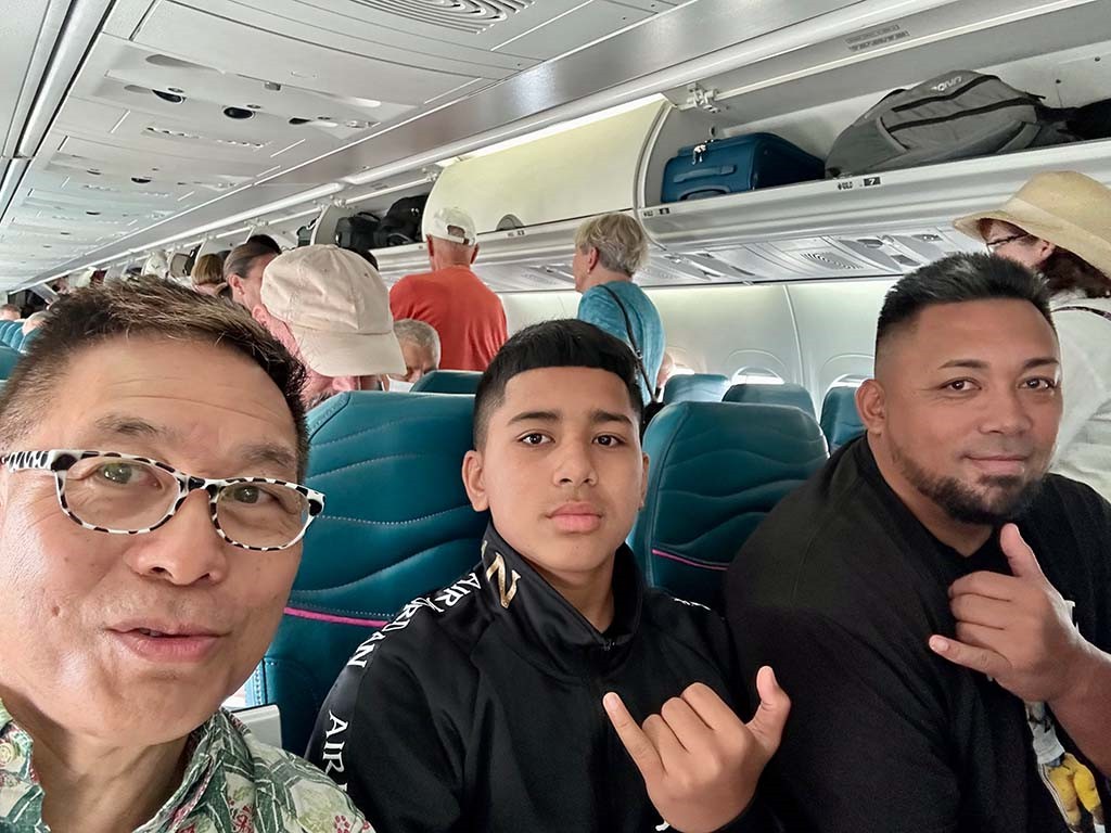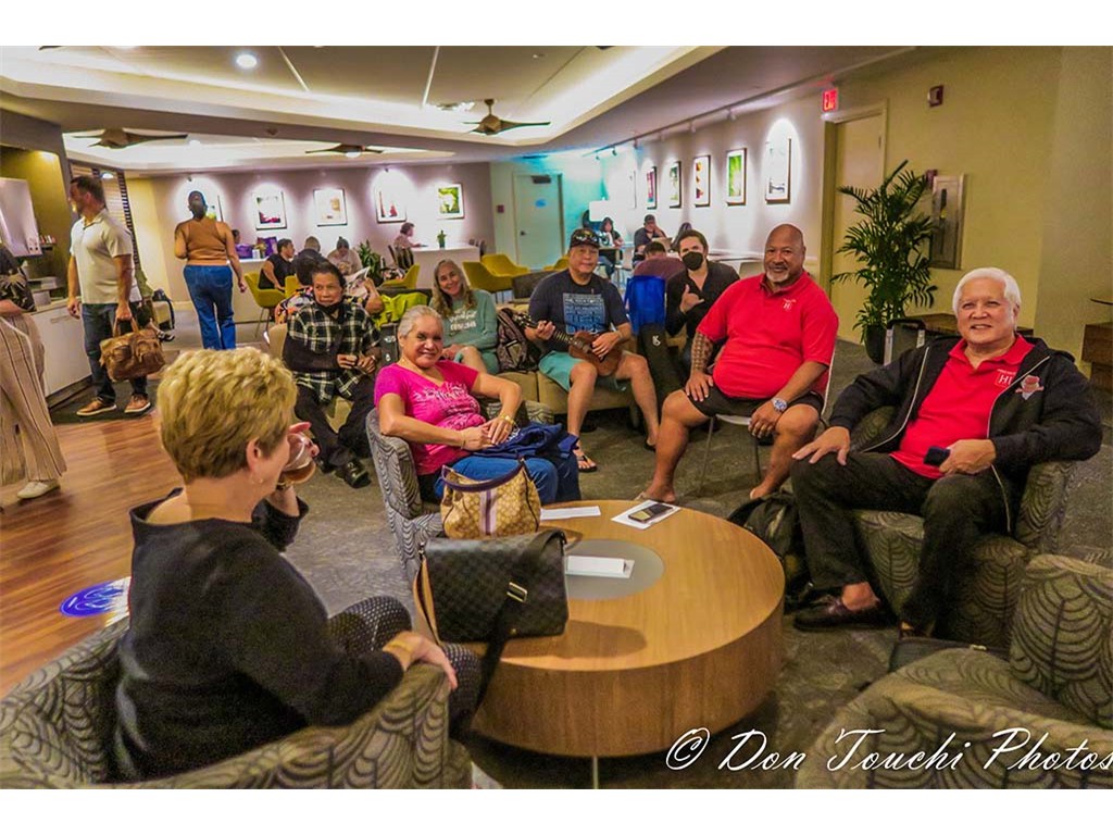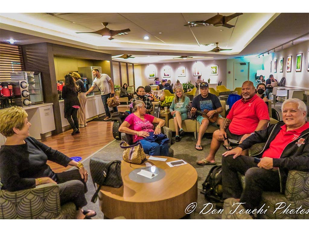 Waiting in the Hawaiian Airlines lounge: Sharon Ching, Shirley Holu, Bobby Ingano, Napua Asing, Kaipo Asing, Larry Holu, Joseph Zayac, and Addison Ching. PC-Don Touchi