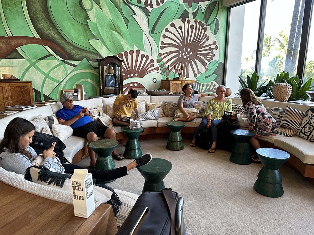 Shirley Holu, Bobby Ingano, Alan Akaka, and Larry Holu wait in the Hawaiian Airlines lounge. Behind Alan: Napua and Kaipo Asing. PC-Addison Ching