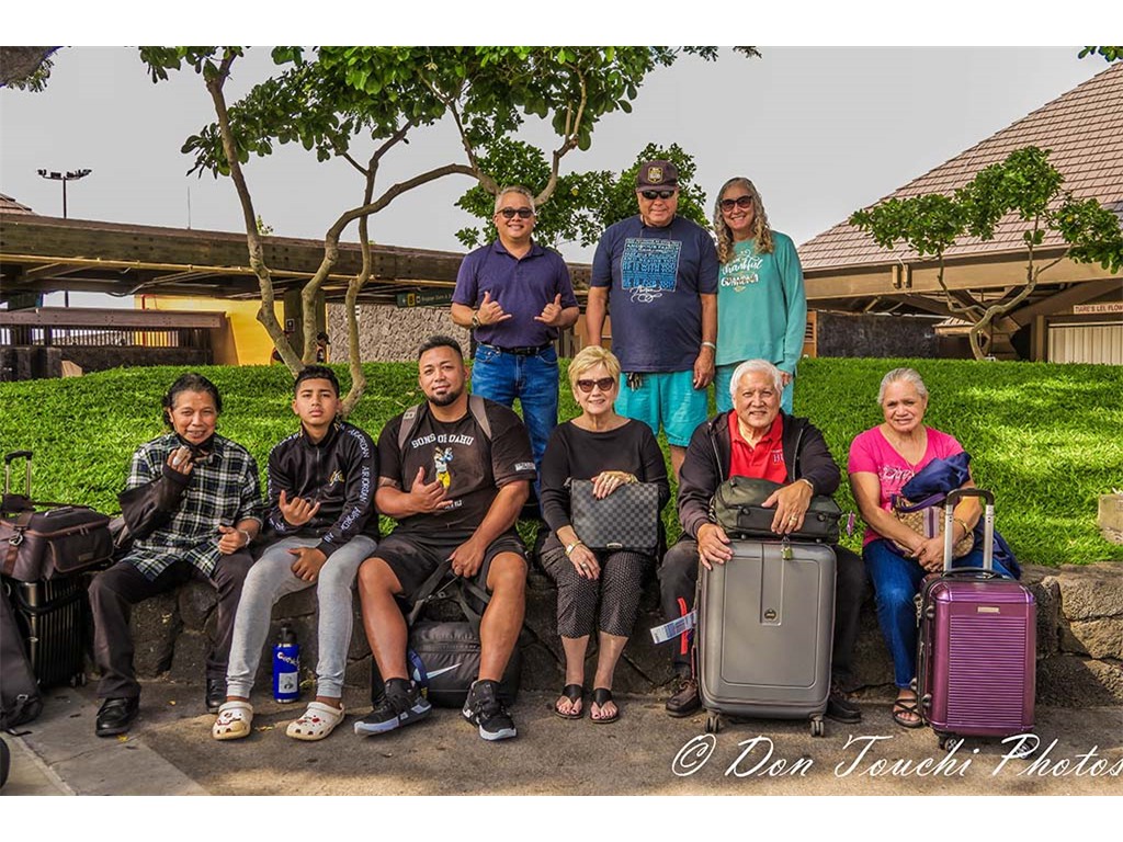 At the Kona Airport: Bobby Ingano, Enosa Lyman, Shane Lyman, Sharon Ching, Addison Ching, Shirley Holu. Standing: Ed Punua, Kaipo Asing, and Napua Asing. PC-Don TouchiBack to Gallery: 2022 Festival