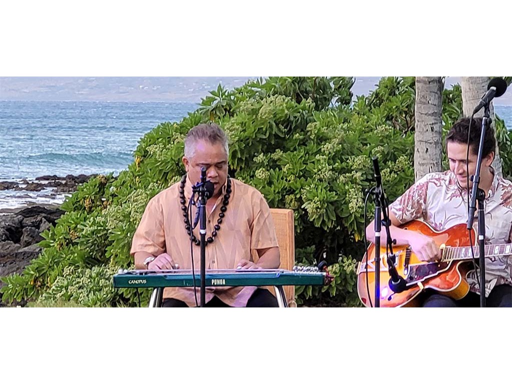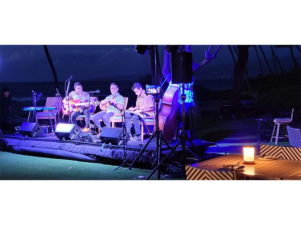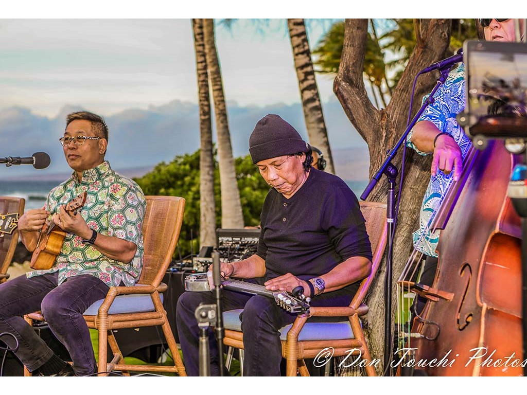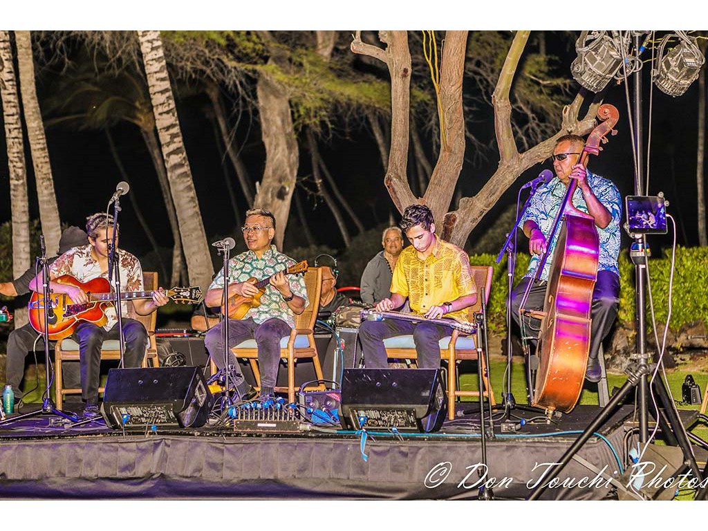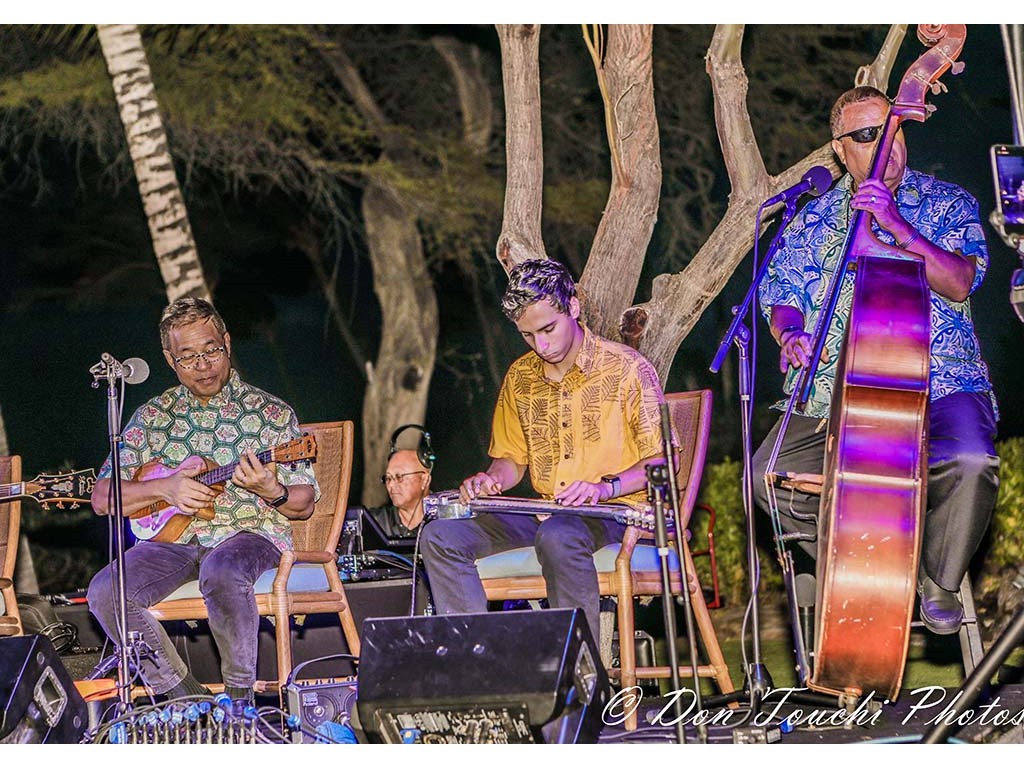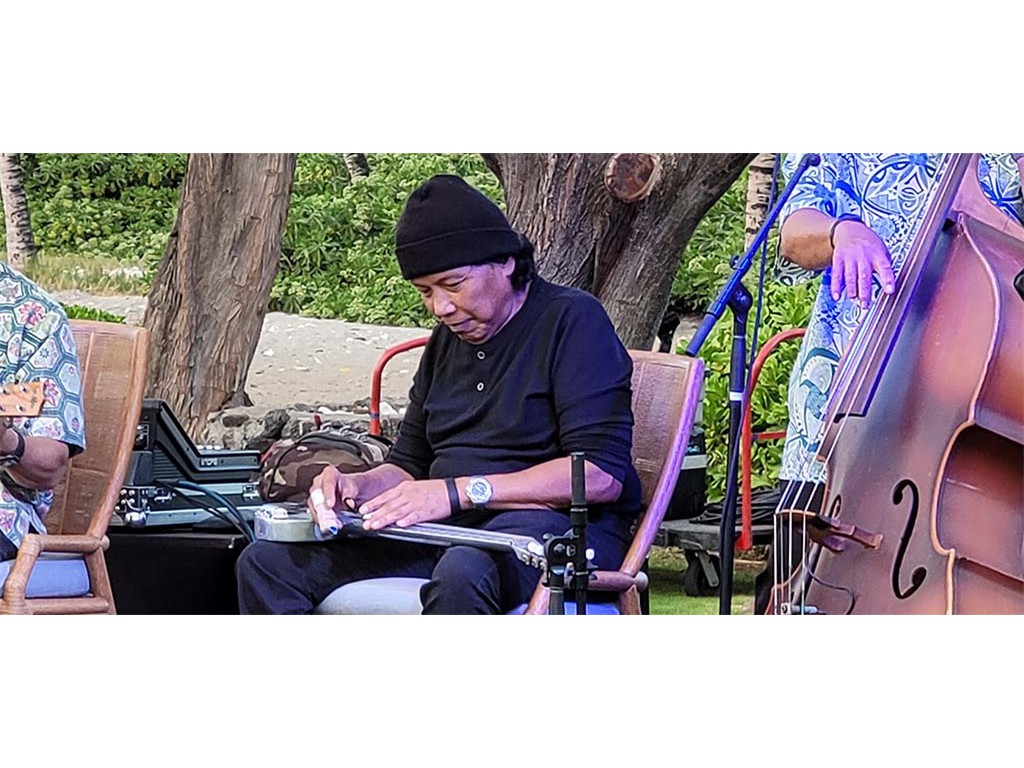 A kanikapila featuring festival musicians was presented Thursday evening at the resort's Canoe House restaurant as a part of the Hawai‘i Island Steel Guitar Experience at Mauna Lani. Restaurant guests were treated to live Hawaiian entertainment performed by festival musicians braving the fierce wind conditions.