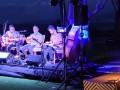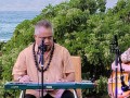 The outdoor stage at the Canoe House. From left: Ed Punua, Joseph Zayac, Alan Akaka, Bobby Ingano, Kaipo Asing, Enosa Lyman, and Shirley Holu. The outdoor stage experienced fierce wind conditions. PC-Addison Ching.