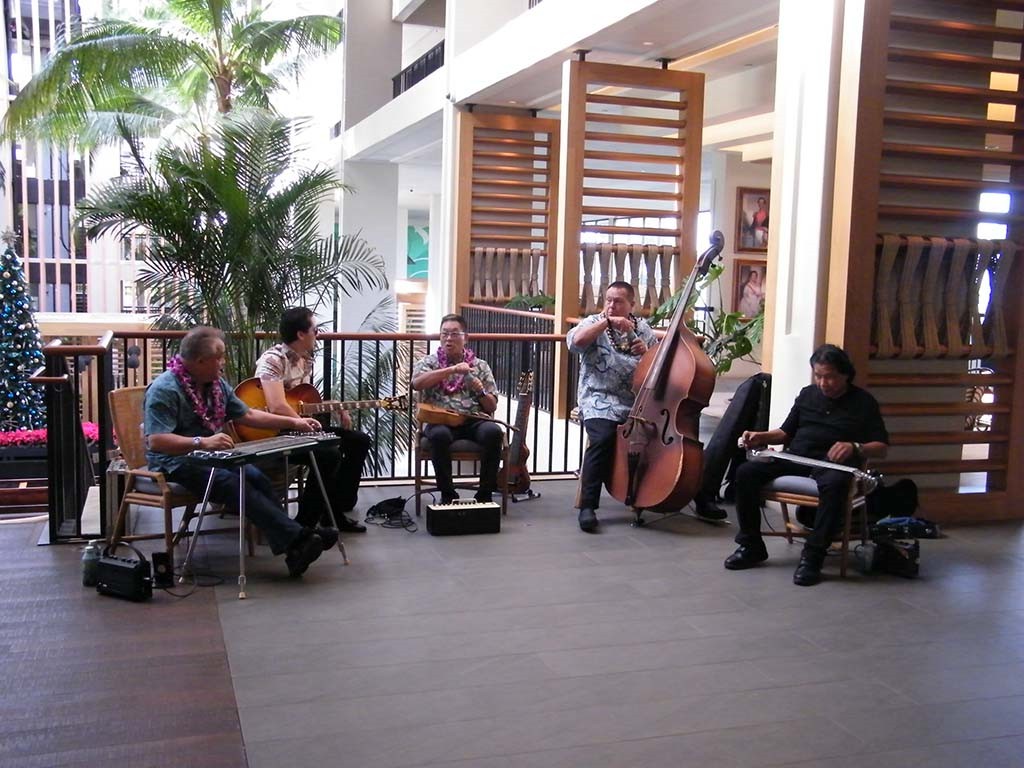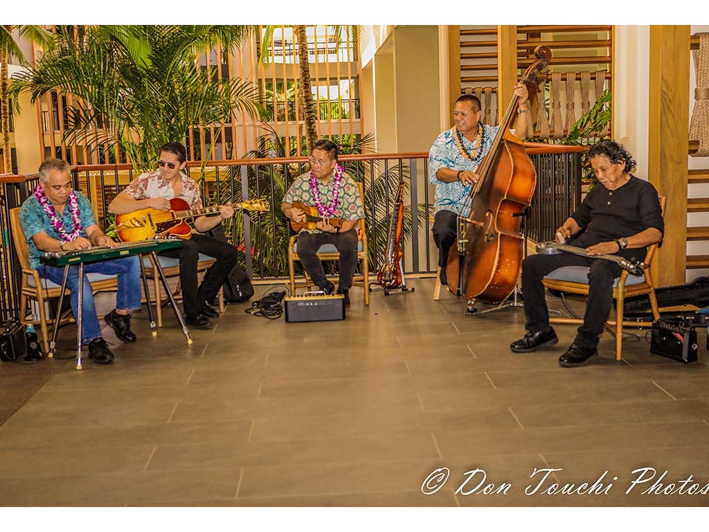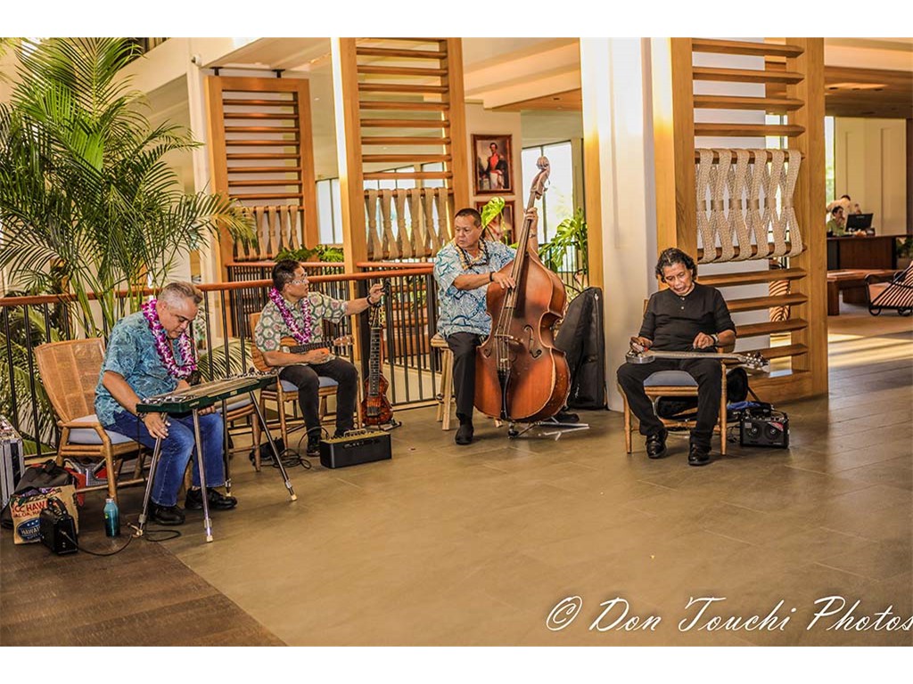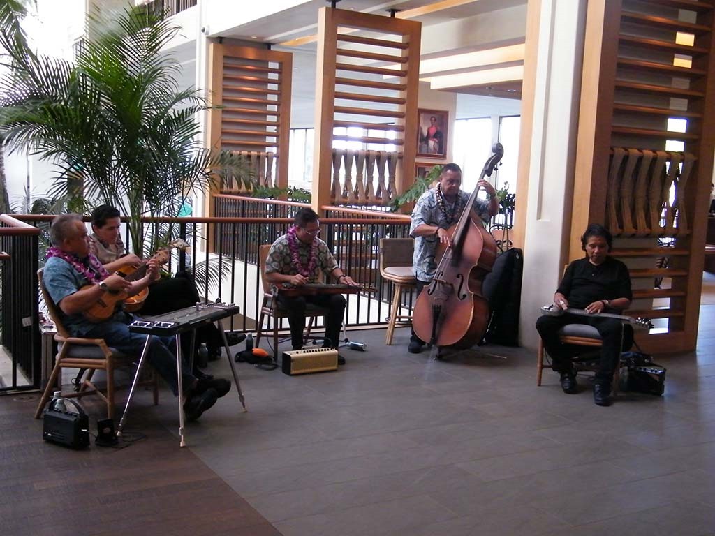 The lobby kanikapila was set up to greet resort guests as they entered the lobby area. From left: Ed PUnua, Alan Akaka, Kaipo Asing, and Bobby Ingano.
