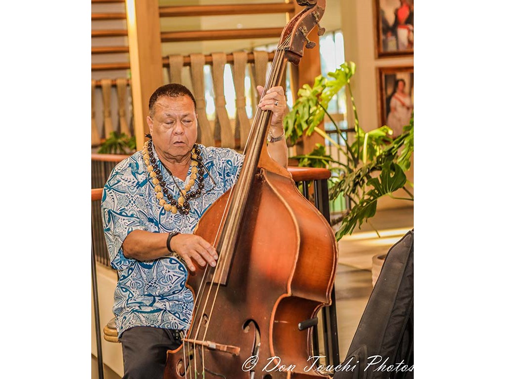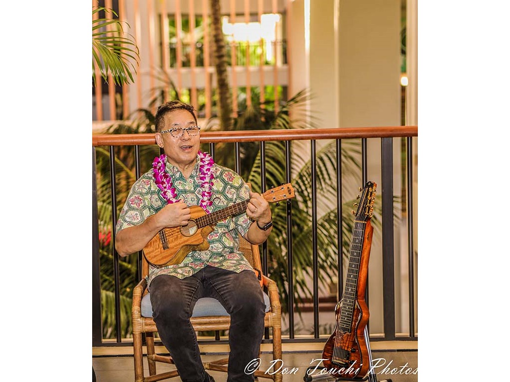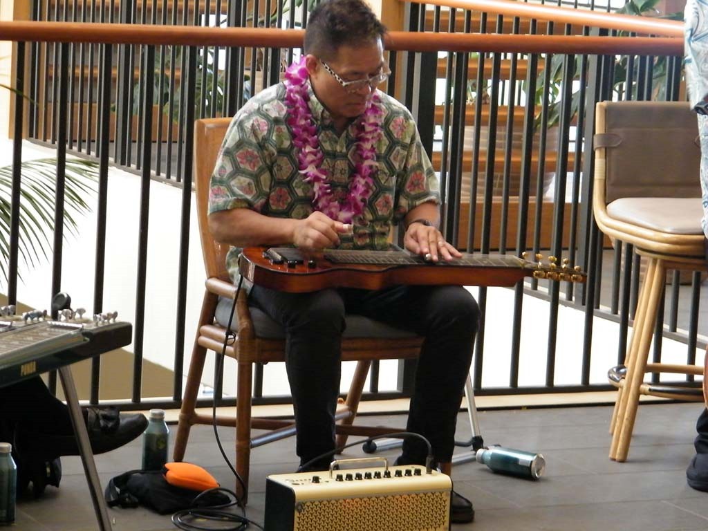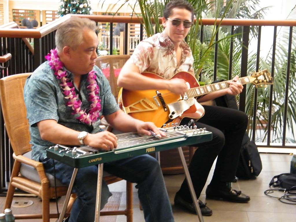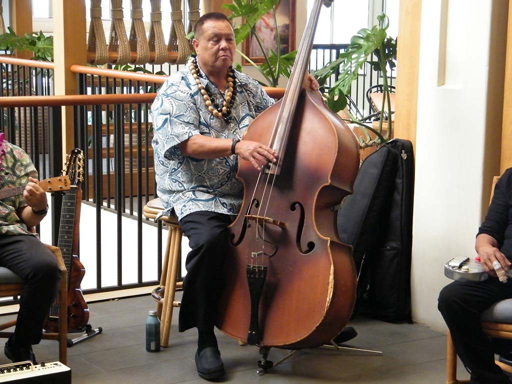 The lobby kanikapila was set up to greet resort guests as they entered the lobby area. From left: Ed PUnua, Alan Akaka, Kaipo Asing, and Bobby Ingano.