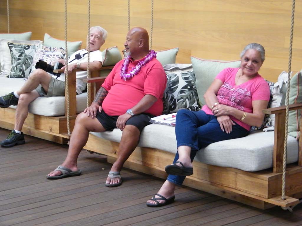 The staff relaxes during a break in the action. From left: Photographer Don Touchi, HiMELE director Larry Holu, and Shirley Holu.