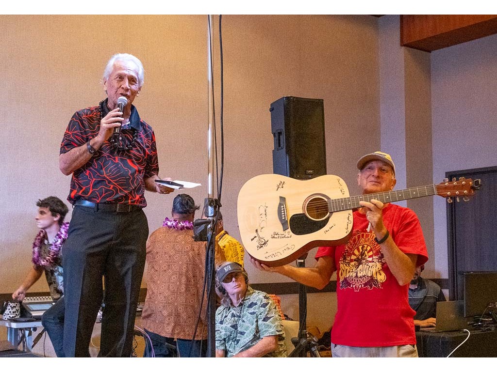 Kimo Kahoano announces the auction for a standard guitar converted to a steel guitar by Dan Tremblay and signed by all festival artists.