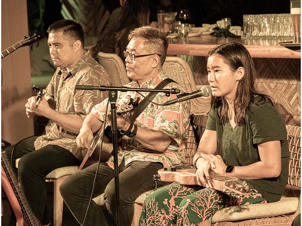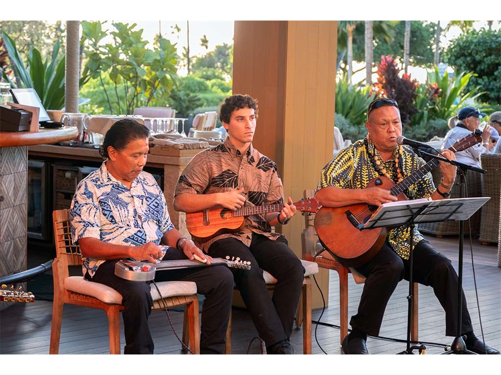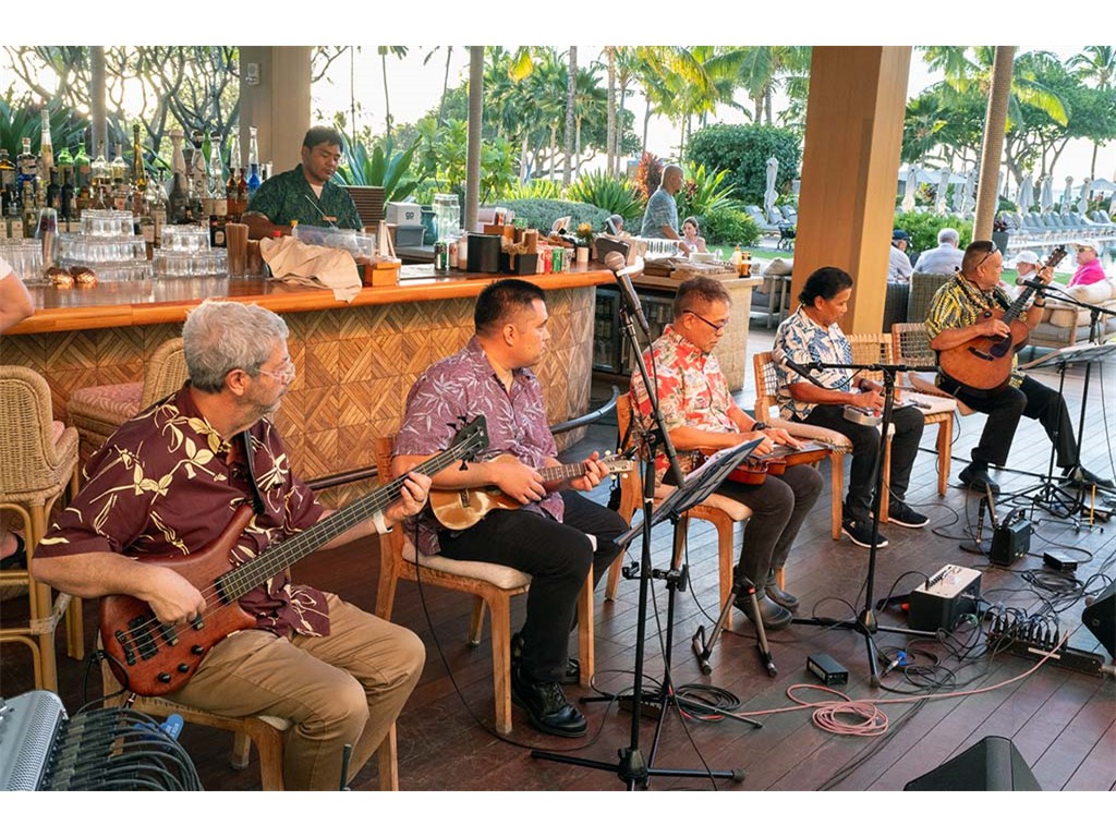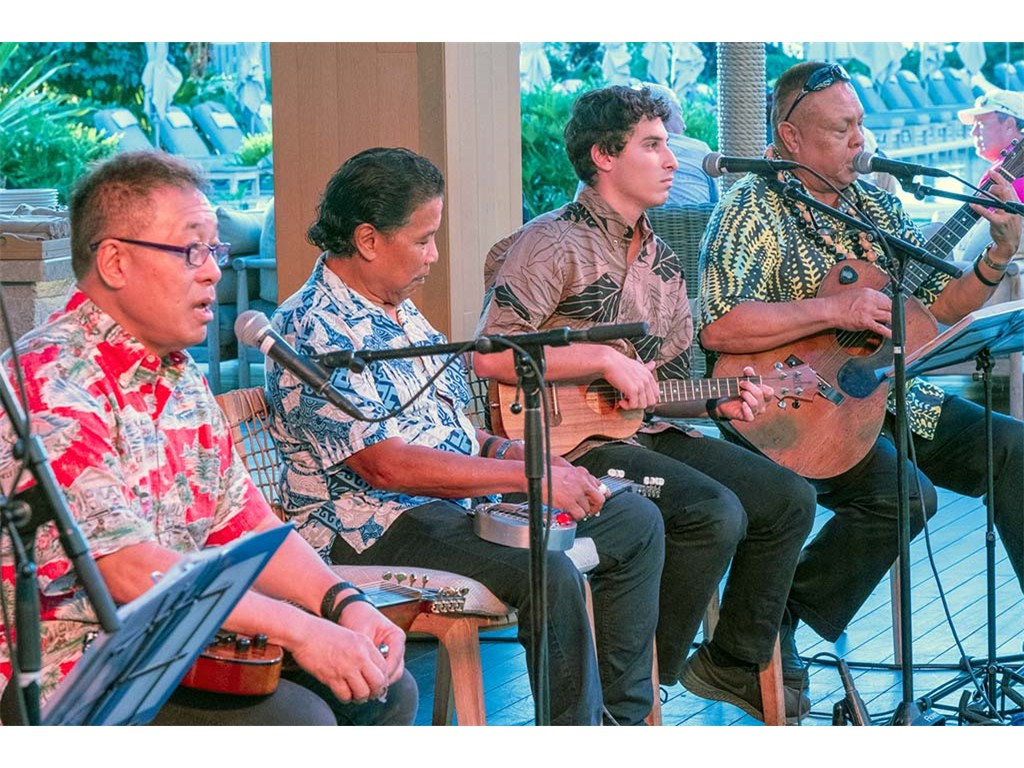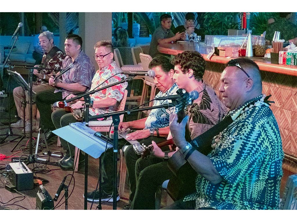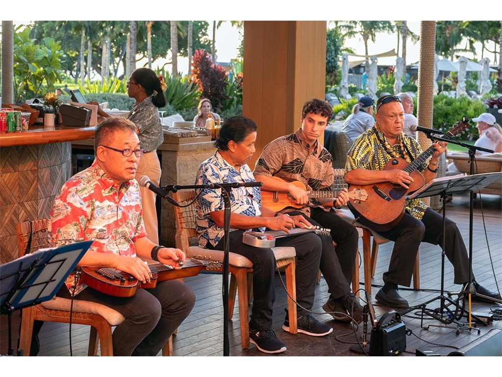 A kanikapila was held on Thursday from 5:00 PM to 7:30 PM providing entertainment for the resort's HaLani Restaurant. Participants included some festival muusicians and NextGen steel guitarists. Musicians were observed playing multiple instrumentss throughout the kanikapila, demonstrating their versatility.