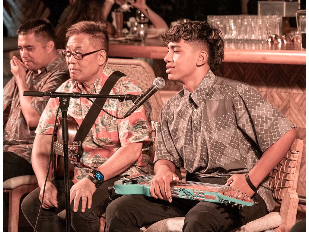 NextGen steel guitarist Hiʻipoi Lindsey with Alan Akaka and Bobby Ingano.
