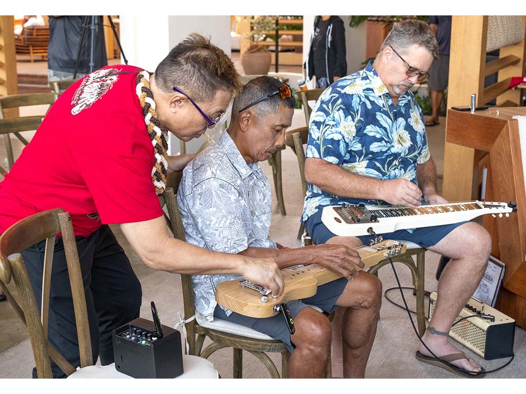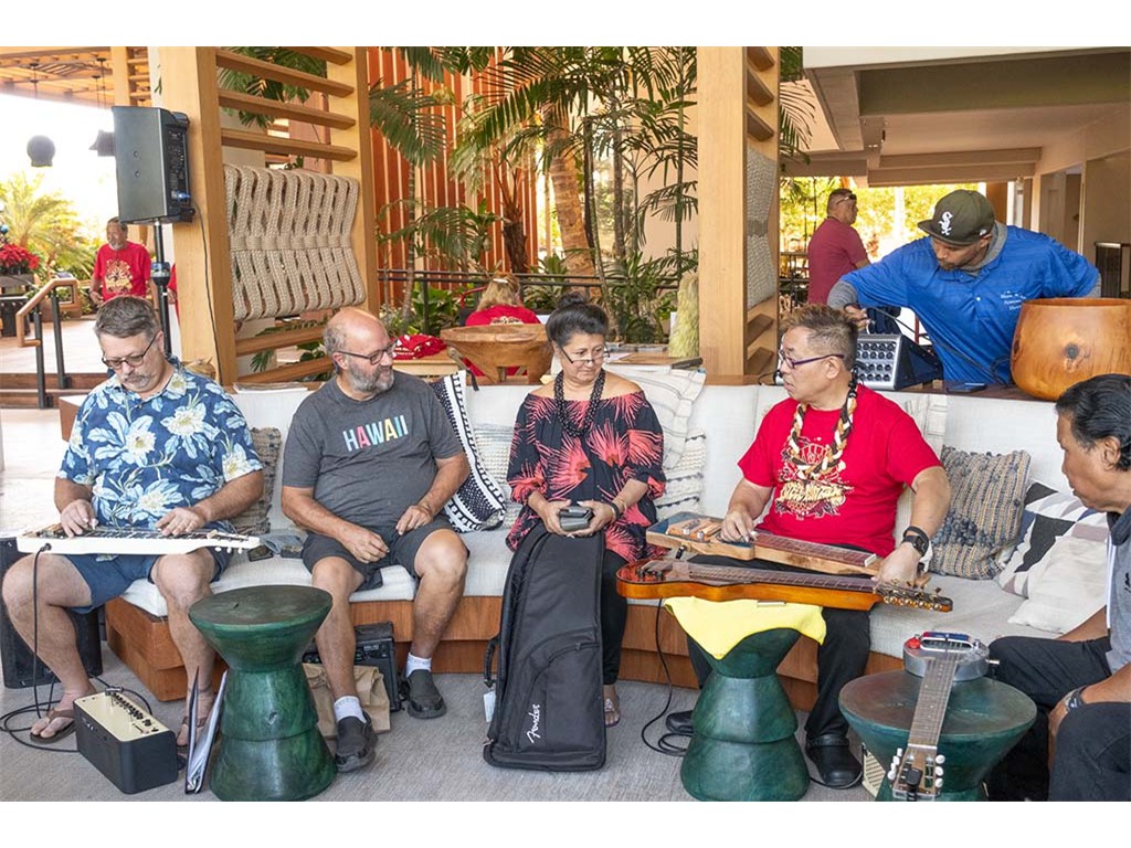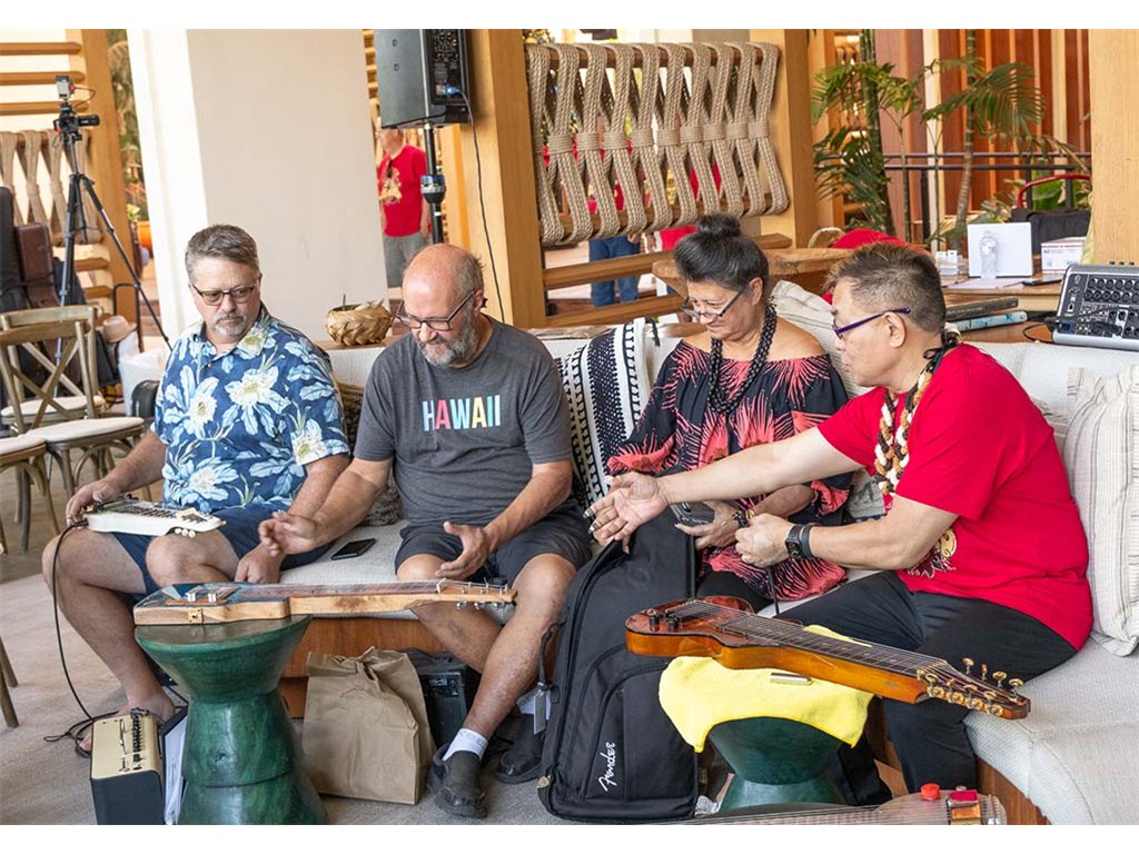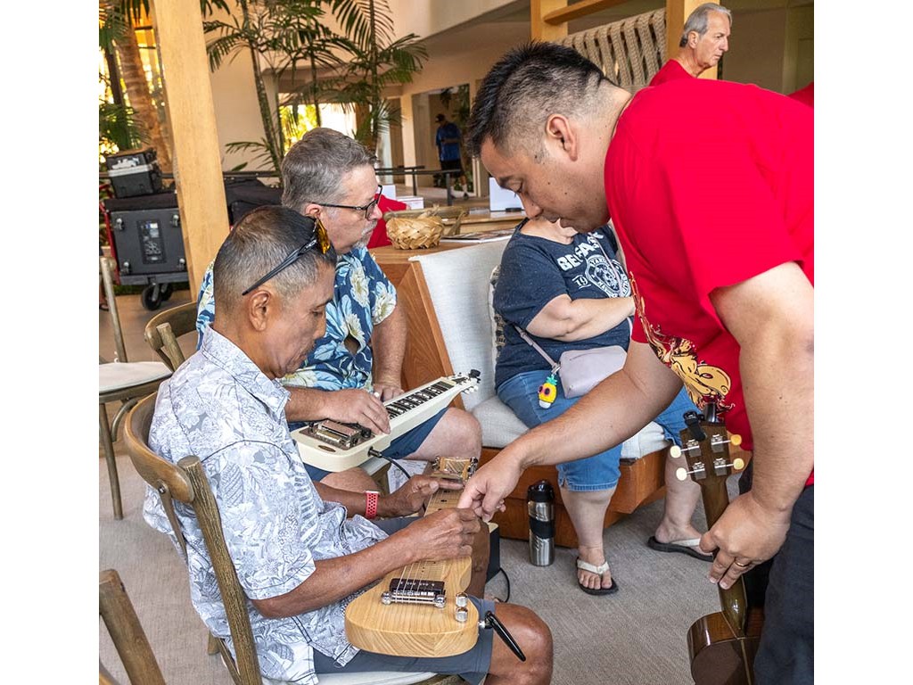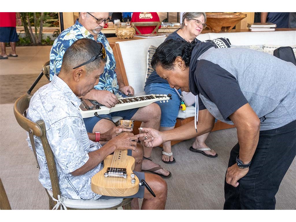 A "Learn to Play" workshop and an open talk story were conducted on Saturday morning at Hale I‘iki, the downstairs office area of the hotel's Cultural Director Danny Akaka, Jr. Alan Akaka, Bobby Ingano, and Kaipo Lindsey helped festival guests navigate the Hawaiian steel guitar.