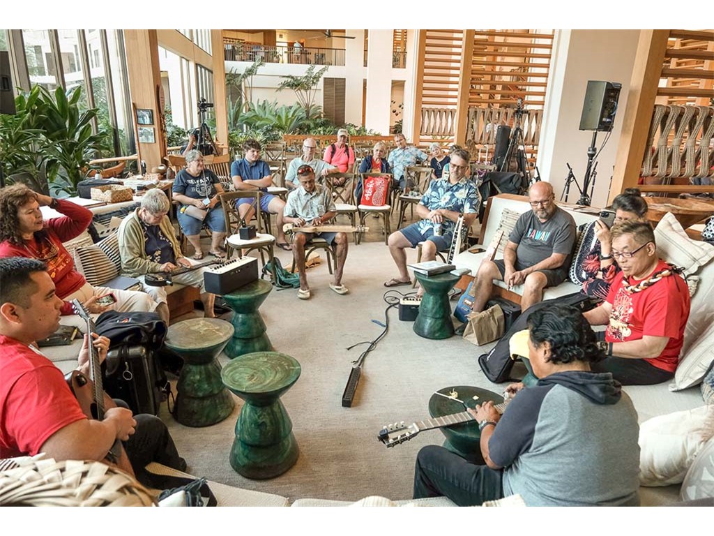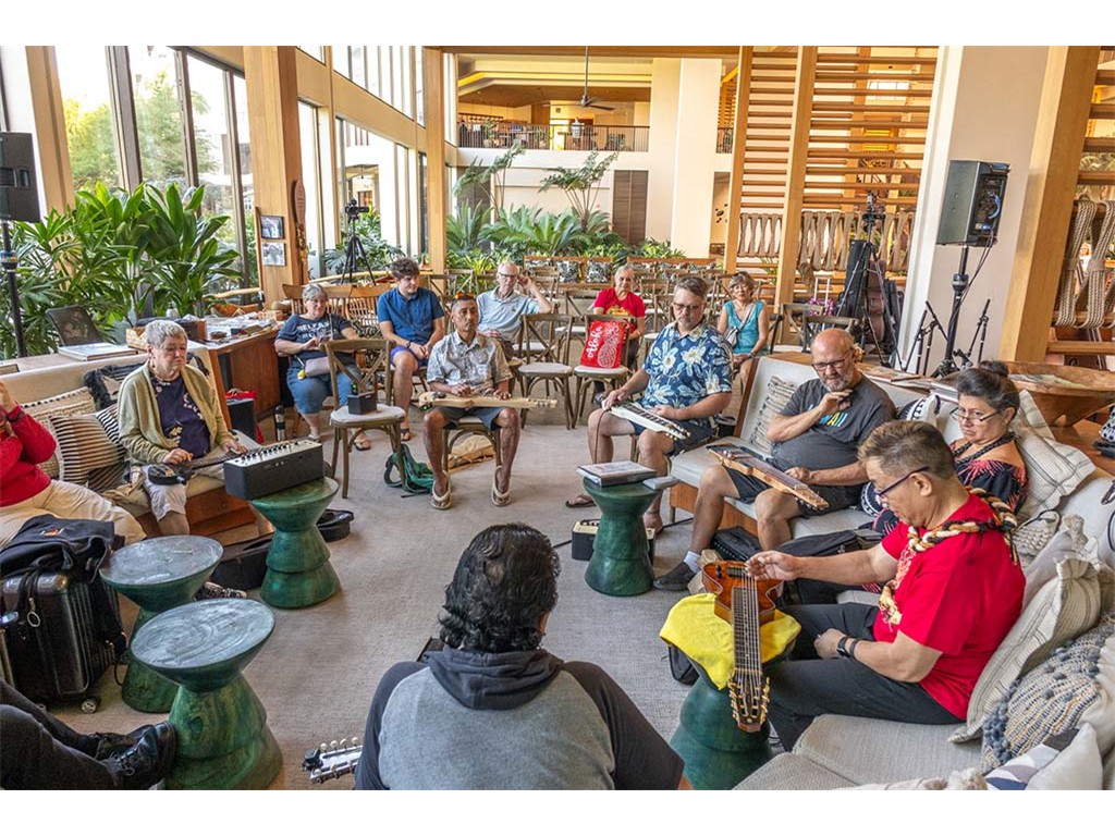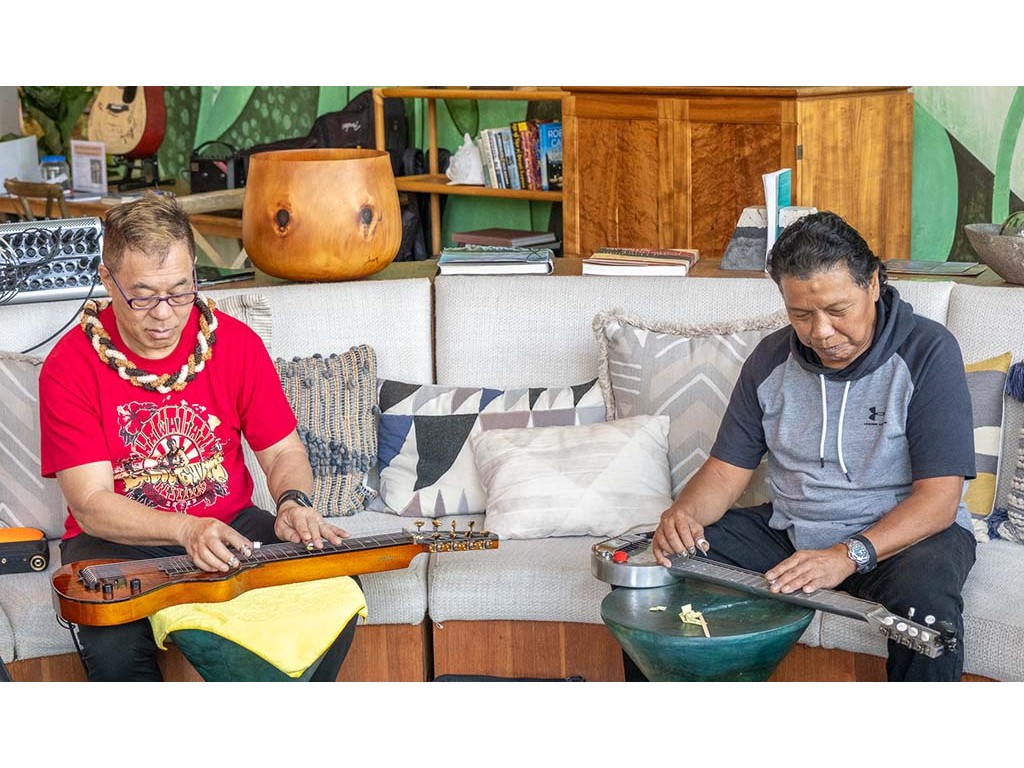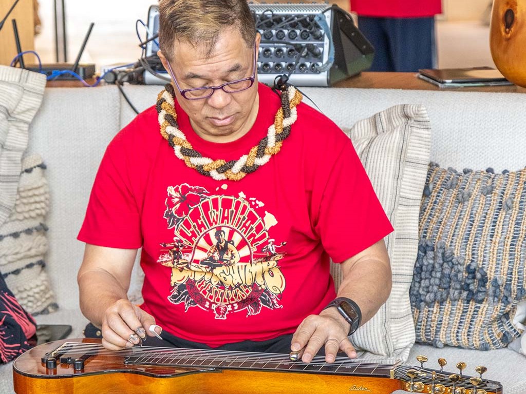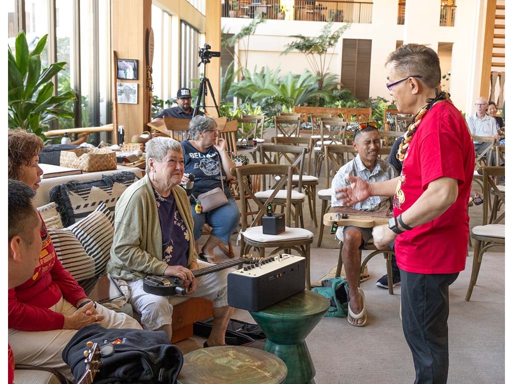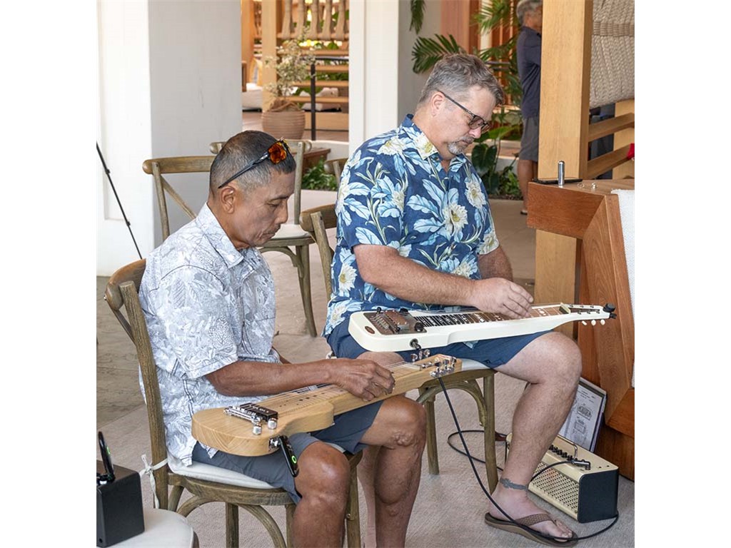 A "Learn to Play" workshop and an open talk story were conducted on Saturday morning at Hale I‘iki, the downstairs office area of the hotel's Cultural Director Danny Akaka, Jr. Alan Akaka, Bobby Ingano, and Kaipo Lindsey helped festival guests navigate the Hawaiian steel guitar.