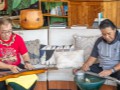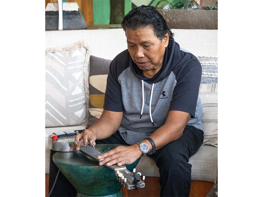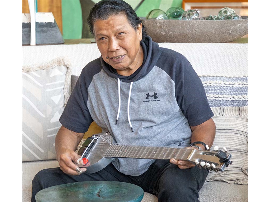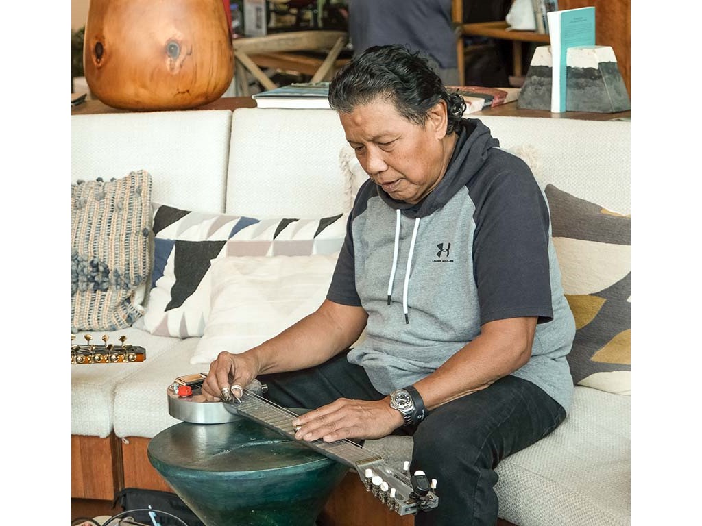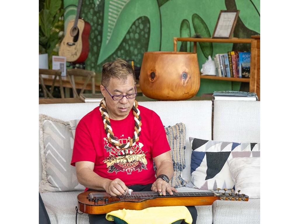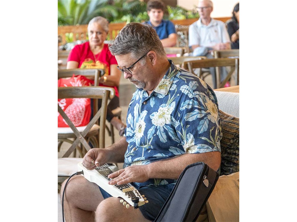 A "Learn to Play" workshop and an open talk story were conducted on Saturday morning at Hale I‘iki, the downstairs office area of the hotel's Cultural Director Danny Akaka, Jr. Alan Akaka, Bobby Ingano, and Kaipo Lindsey helped festival guests navigate the Hawaiian steel guitar.