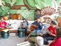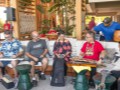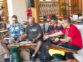 Kevin practices on his steel while Leilani Kahoano and a festival guest watch Alan demonstrate on the guest's steel guitar. Bobby Ingano looks on.