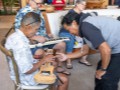 Kevin Speyer watches while Alan gives a festival guest some lap steel pointers. Leilani Kahoano looks on.