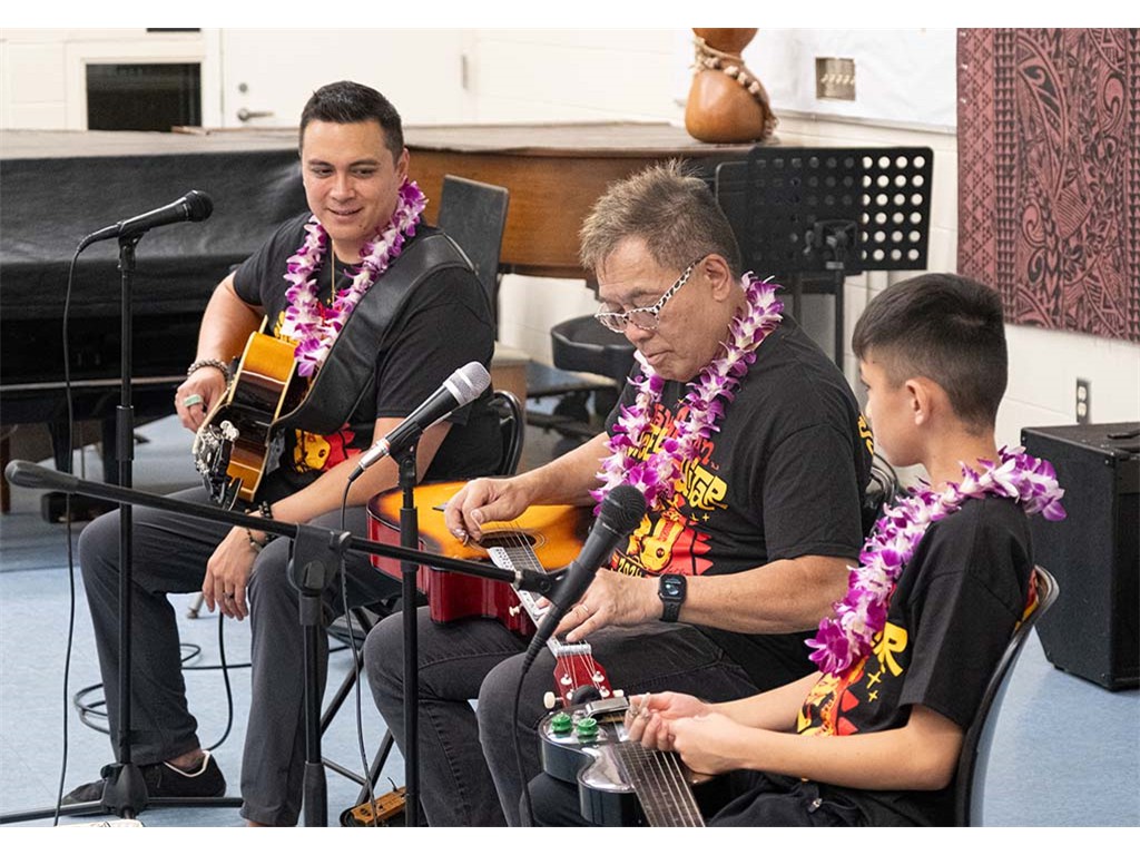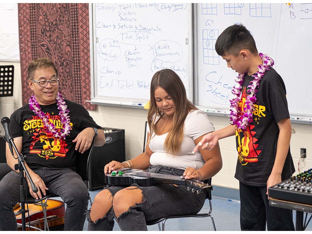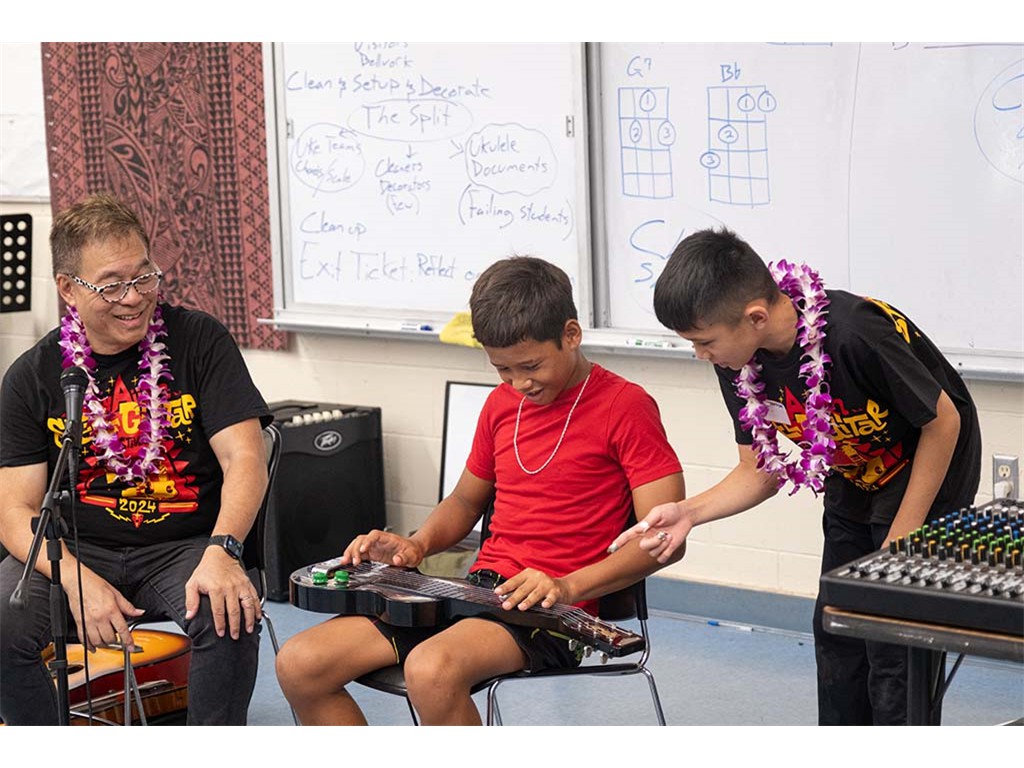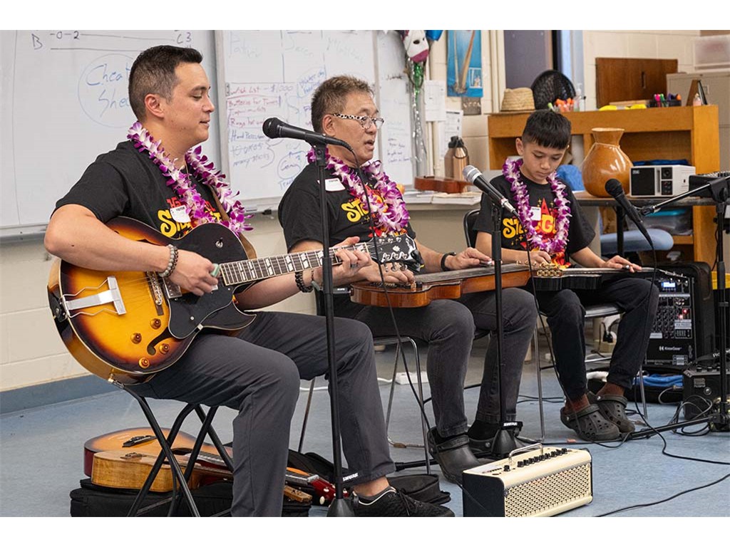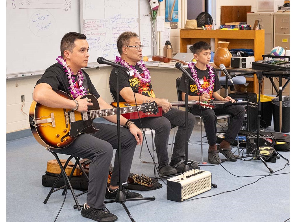 Alan Akaka, NextGen Isaac Woodward, and dad David Woodward visited Kealakehe Intermediate School to give a steel guitar demonstration to the school's students. The presentation included hands-on opportunities for the group.