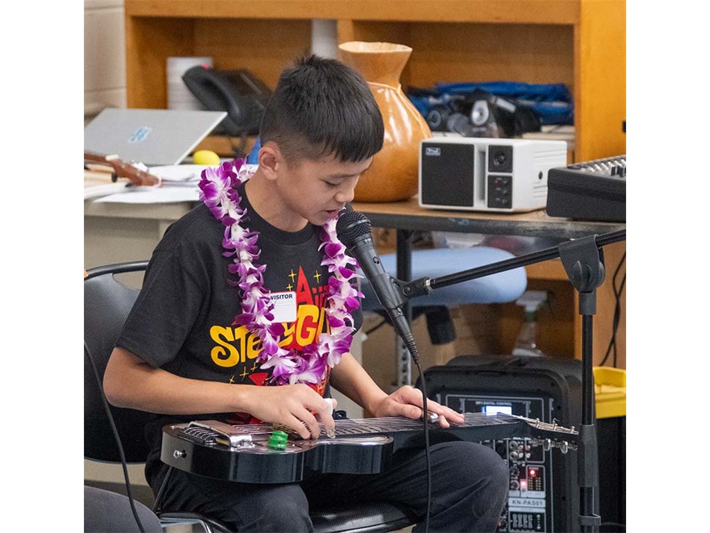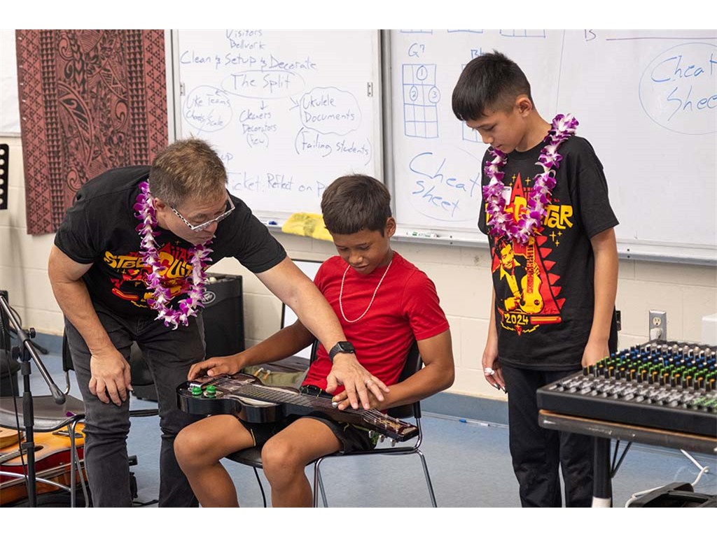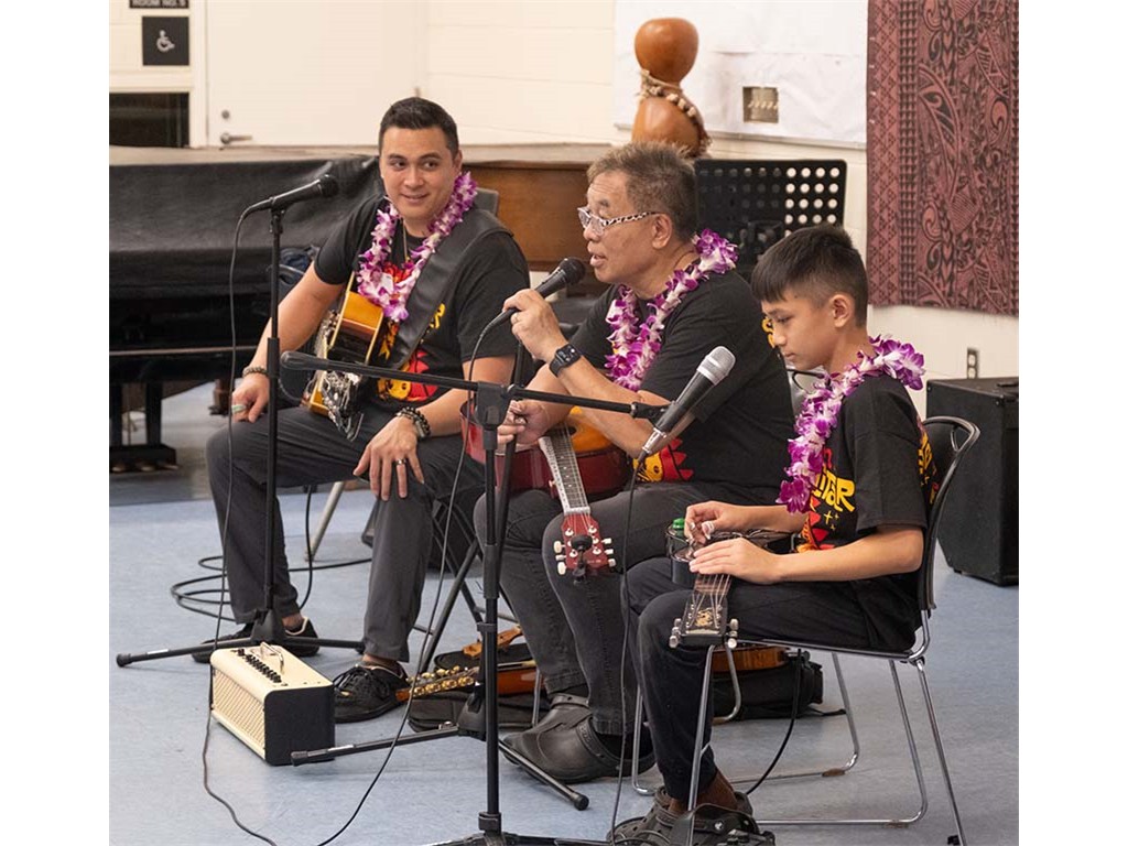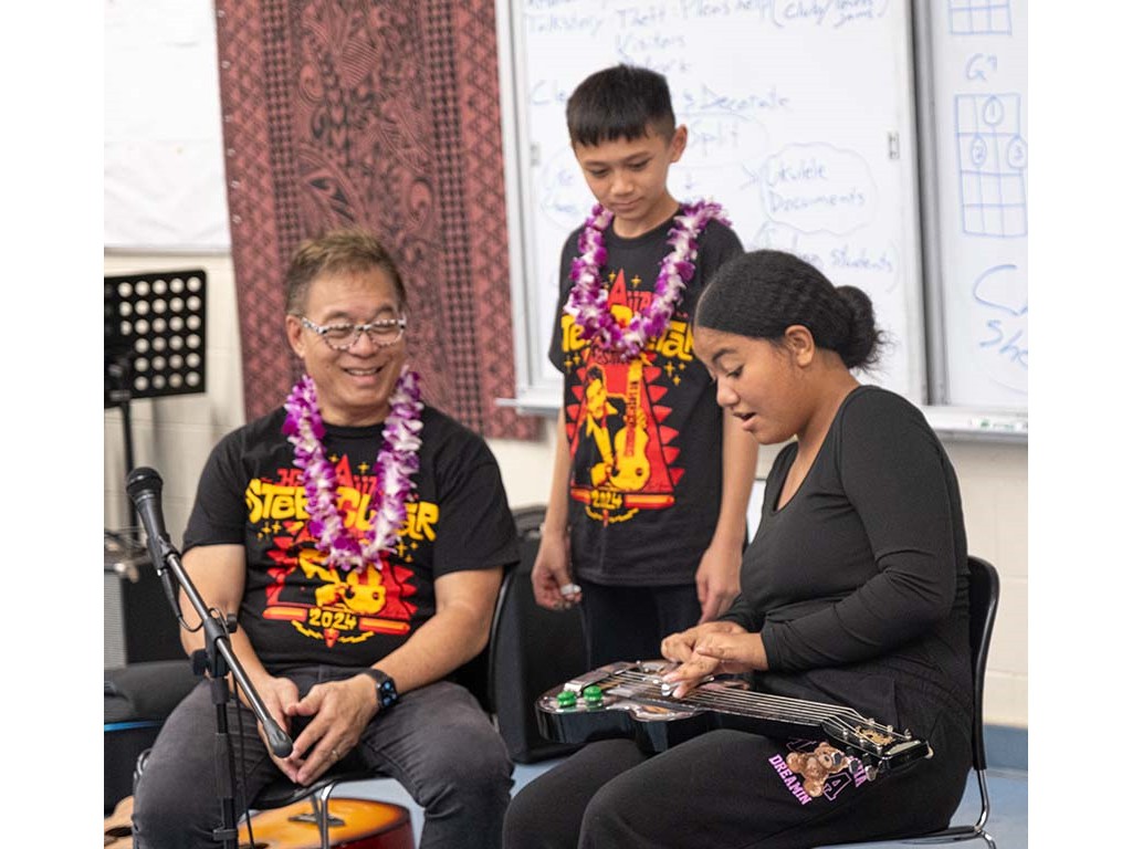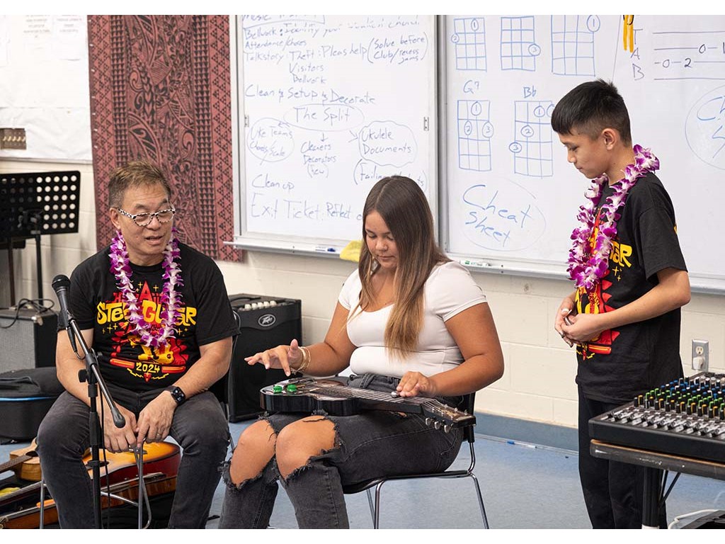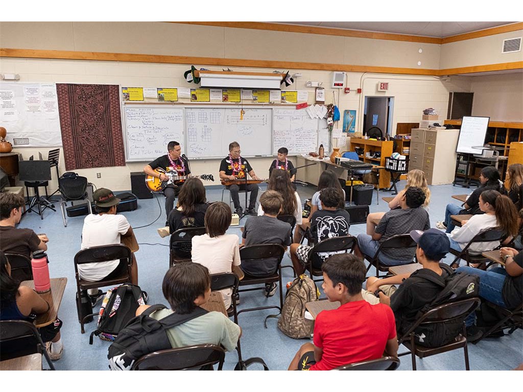Alan Akaka, NextGen Isaac Woodward, and dad David Woodward visited Kealakehe Intermediate School to give a steel guitar demonstration to the school's students. The presentation included hands-on opportunities for the group.