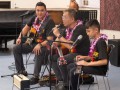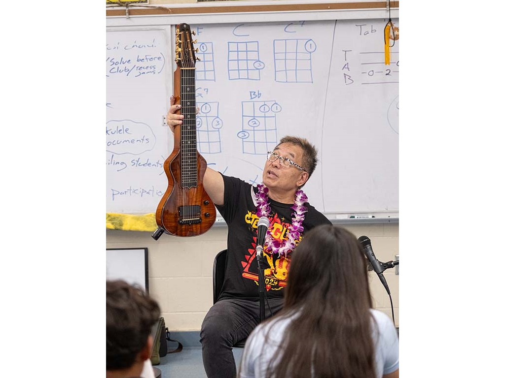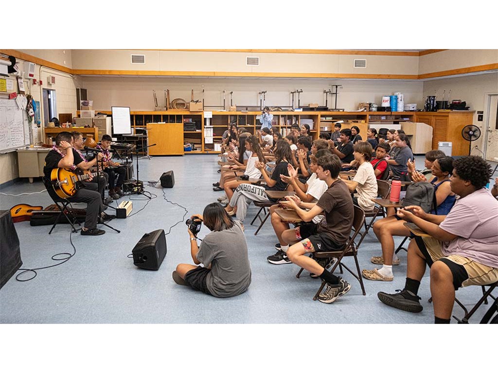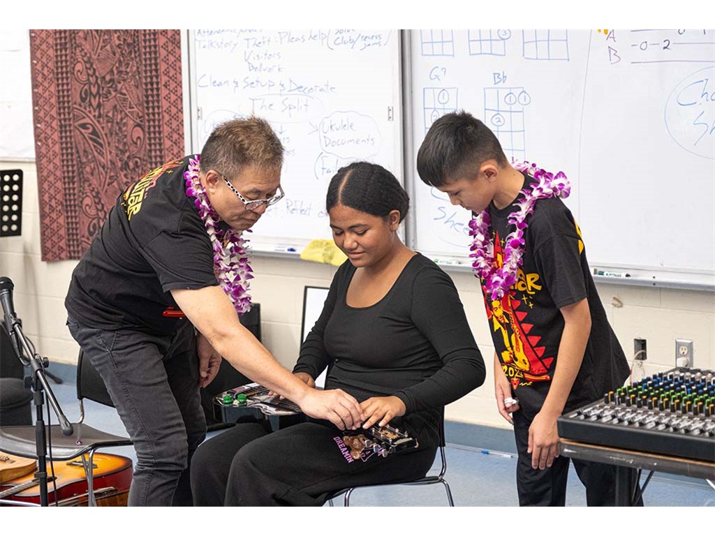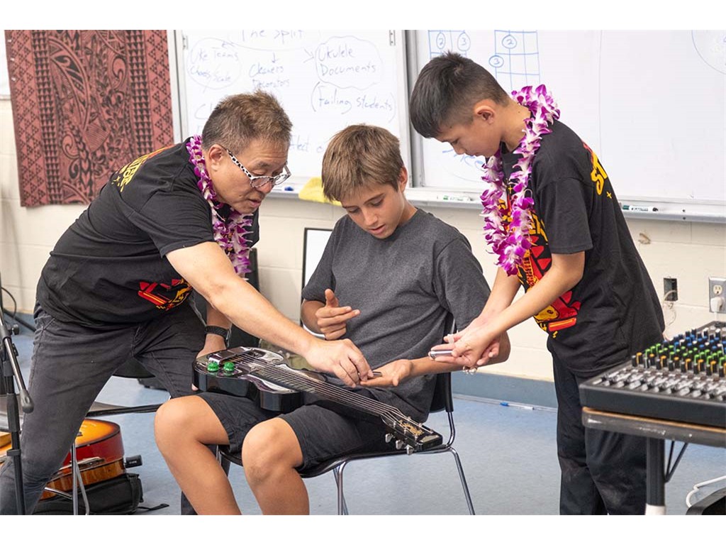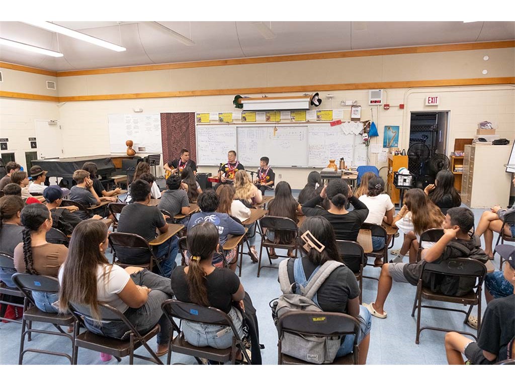 Alan Akaka, NextGen Isaac Woodward, and dad David Woodward visited Kealakehe Intermediate School to give a steel guitar demonstration to the school's students. The presentation included hands-on opportunities for the group.