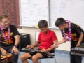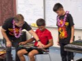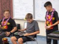 Alan shows another student how to hold the tone bar as Isaac demonstrates how he holds his.