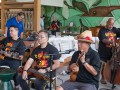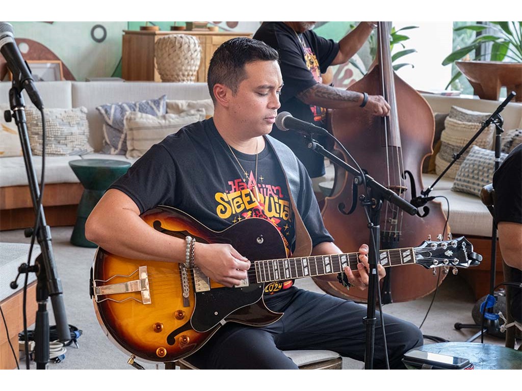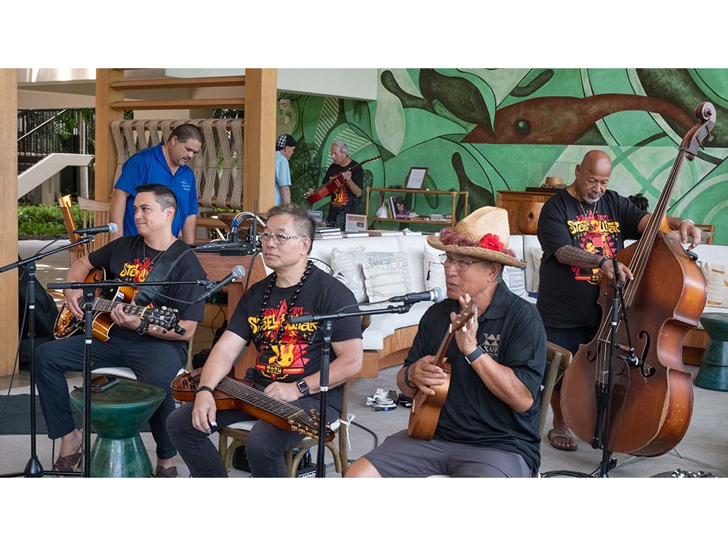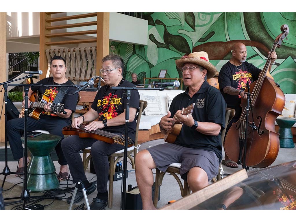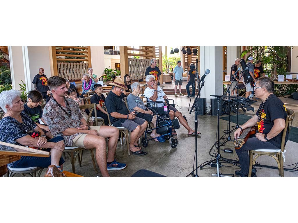 A workshop that combined "talk story" and playing hints was conducted on Saturday morning at Hale I‘iki, the downstairs office area of the hotel's Cultural Director Danny Akaka, Jr. Alan Akaka was joined by his brother Danny Jr., David Woodward, and Larry Holu, and the group also provided musical selections for workshop guests.