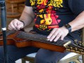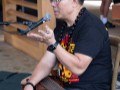 Geri Valdriz discusses Barbara Bonesʻ steel guitar with her as Vicky Van Fechtmann looks on.