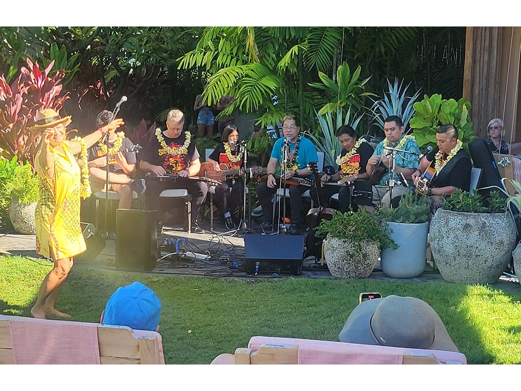 Ethan Speyer, Kevin Speyer, Schuyler Woodward, Alan Akaka, Bobby Ingano, Kaipo Lindsey, and David Woodward with hula by Anna Akaka.